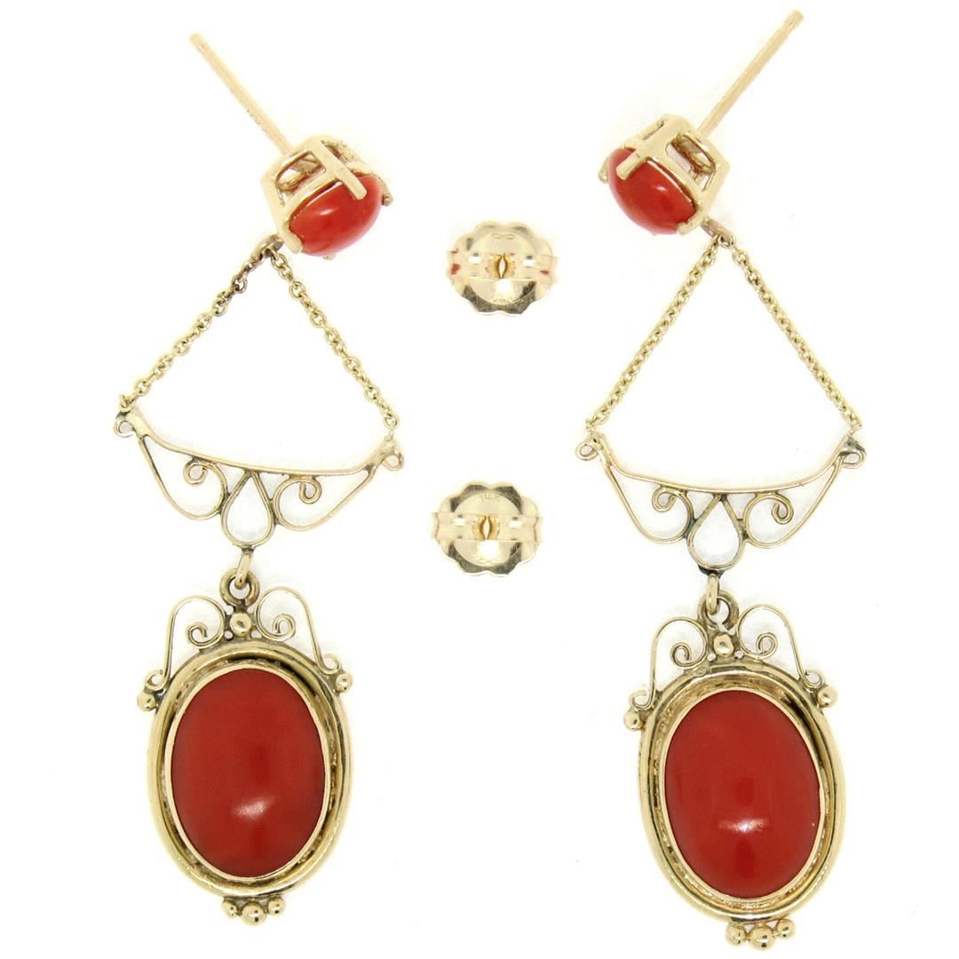 An antique solid 14k yellow gold dangel drop earrings, with 2 oval cabochon cut natural coral (11.30x8.30mm), and 2 round cabochon cut natural coral (5.90-6.00mm).The earrings measure approximately 47.50x16mm and weigh a total of 4.57 grams.