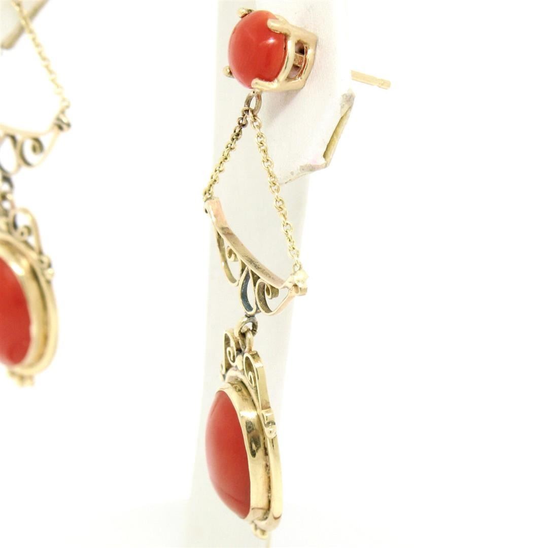 An antique solid 14k yellow gold dangel drop earrings, with 2 oval cabochon cut natural coral (11.30x8.30mm), and 2 round cabochon cut natural coral (5.90-6.00mm).The earrings measure approximately 47.50x16mm and weigh a total of 4.57 grams.