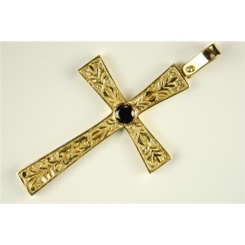 EXTRAORDINARY Vintage 14k GOLD CROSS circa 1950 measuring 2 3/4" in length x 2" in width. There is magnficent ENGRAVING with a round GARNET in the center.