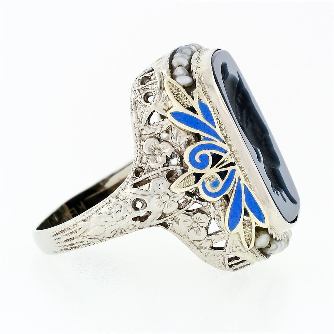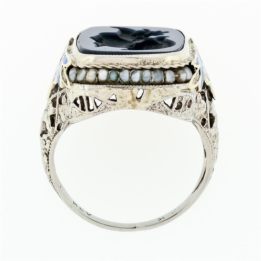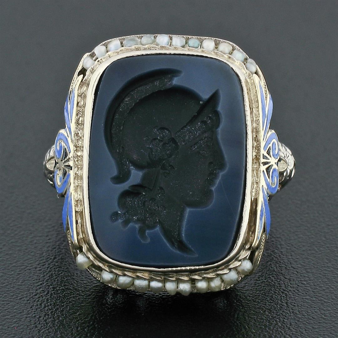 An antique solid 14k white gold intaglio cocktail ring, with blue enamel work, 1 carved rectangular cushion shape natural agate (15.35x11.37mm), with 23 round bead shape seed pearls (0.90mm ). The ring is size 4.5, weighs a total of 4.43 grams, and measures 19.10mm wide.