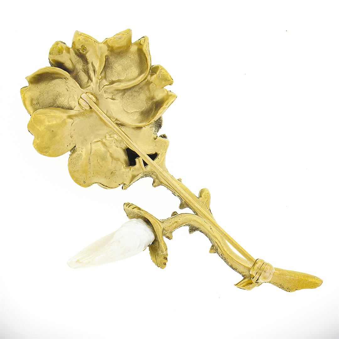 An antique solid 14k yellow gold rose flower pin brooch, with 1 swiss cut natural diamond (G - VS2 ; 0.10ctw), and 1 baroque shape cultured river pearl (13.6x5.5mm). Measures 53.90x31.90mm and weighs a total of 12.10 grams.