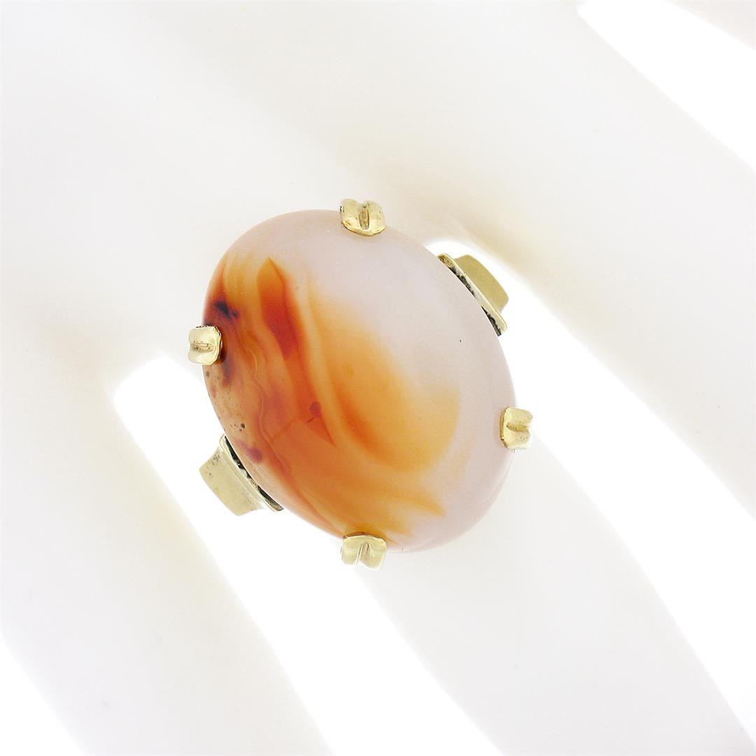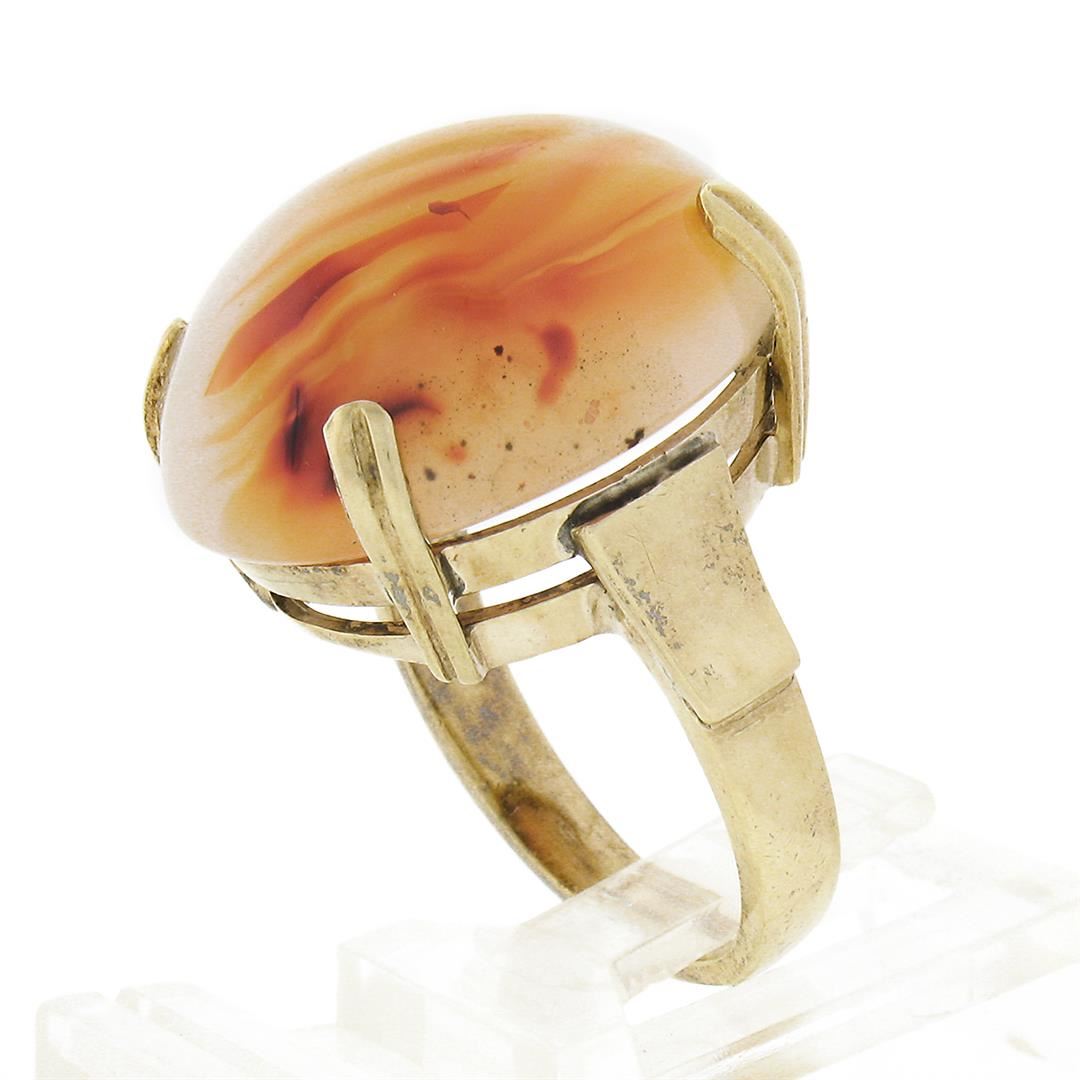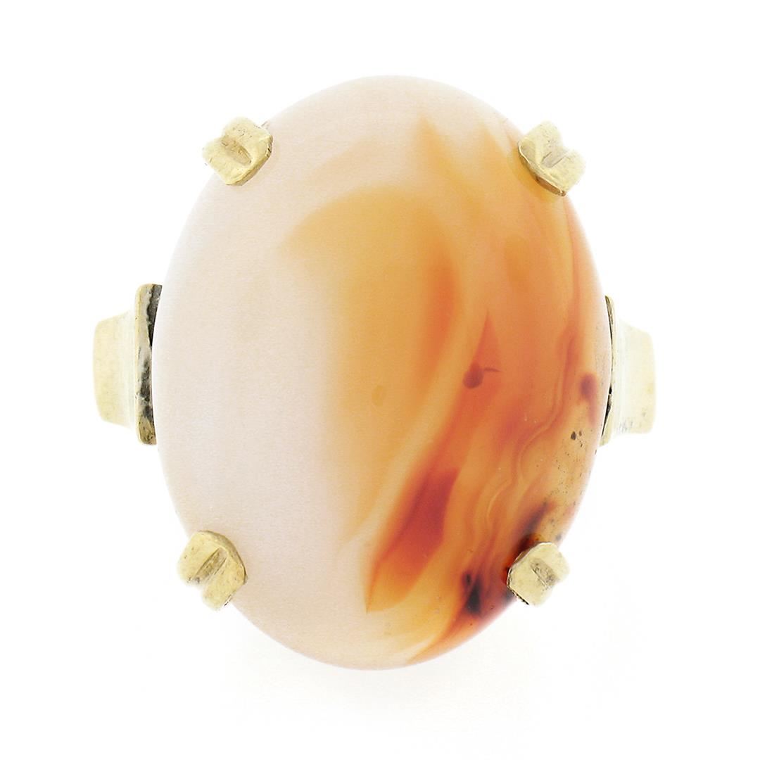 An antique solid 14k yellow gold ring, with 1 oval cabochon cut natural agate (21.50x16.40mm). The ring is size 6.5, weighs a total of 10.63 grams, and measures 21.50mm wide.