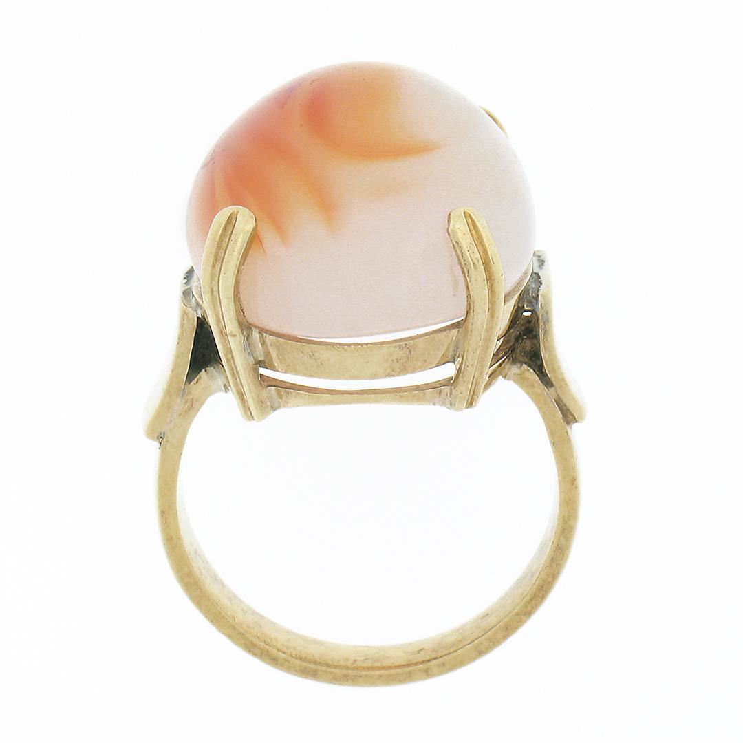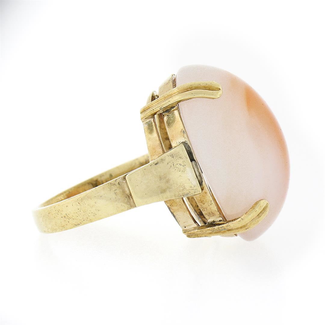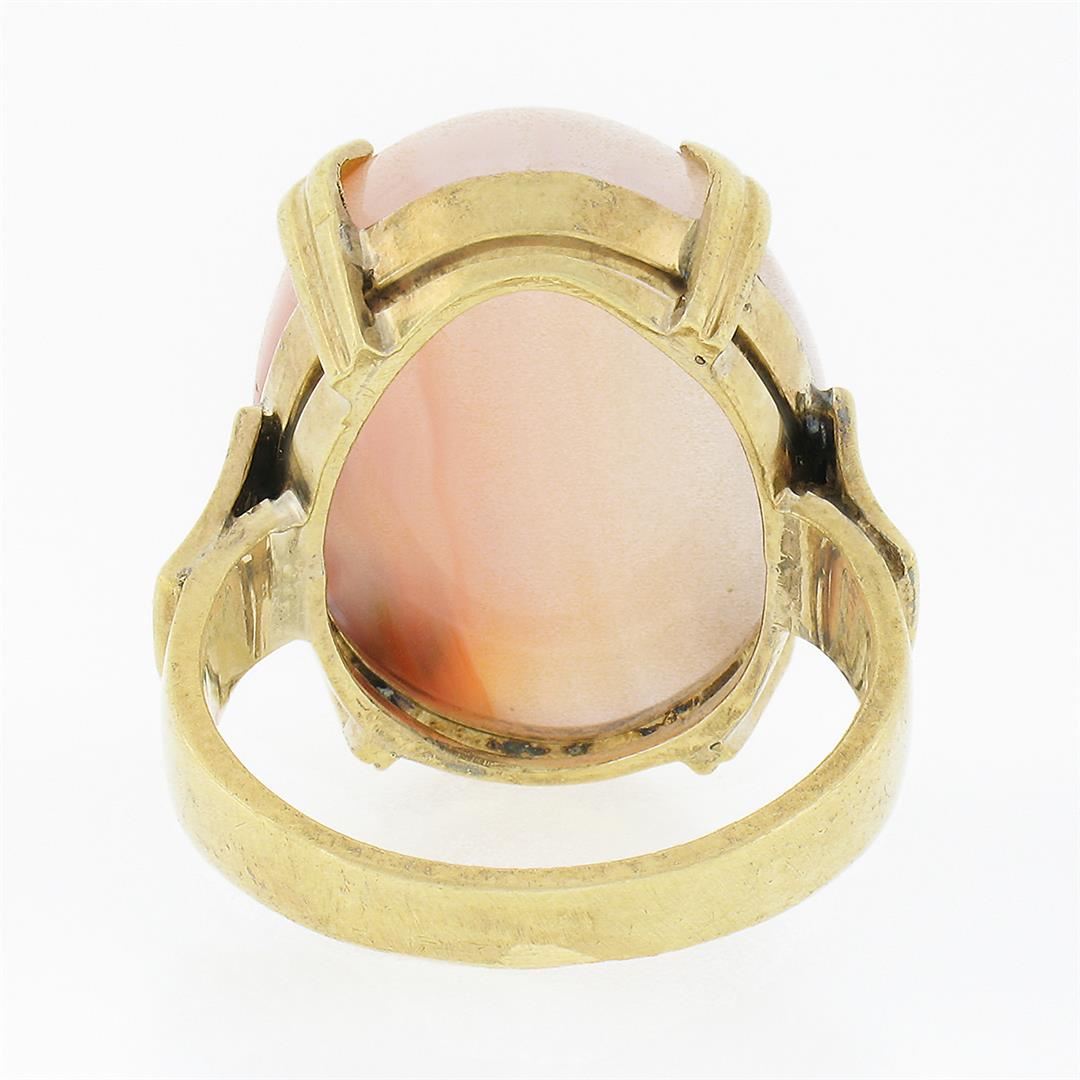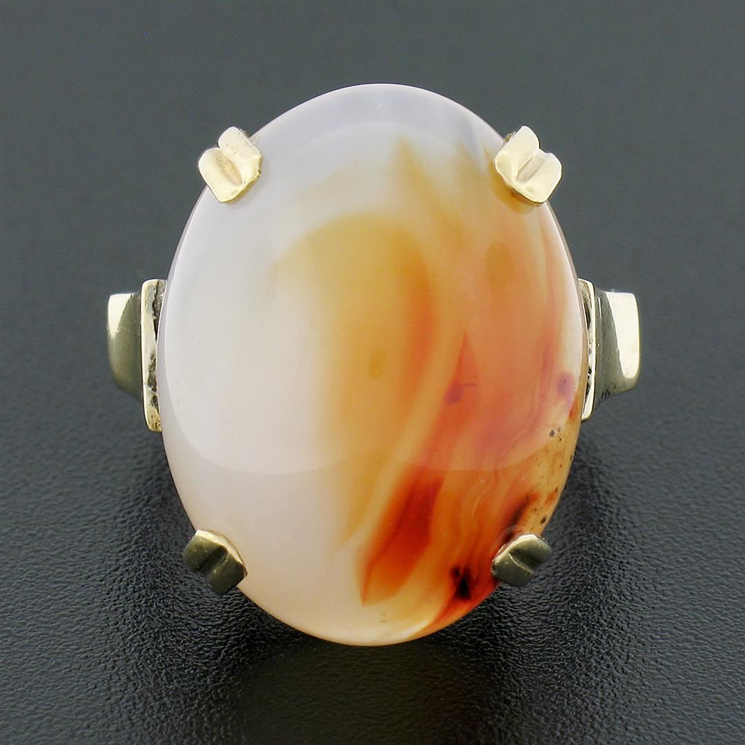 An antique solid 14k yellow gold ring, with 1 oval cabochon cut natural agate (21.50x16.40mm). The ring is size 6.5, weighs a total of 10.63 grams, and measures 21.50mm wide.