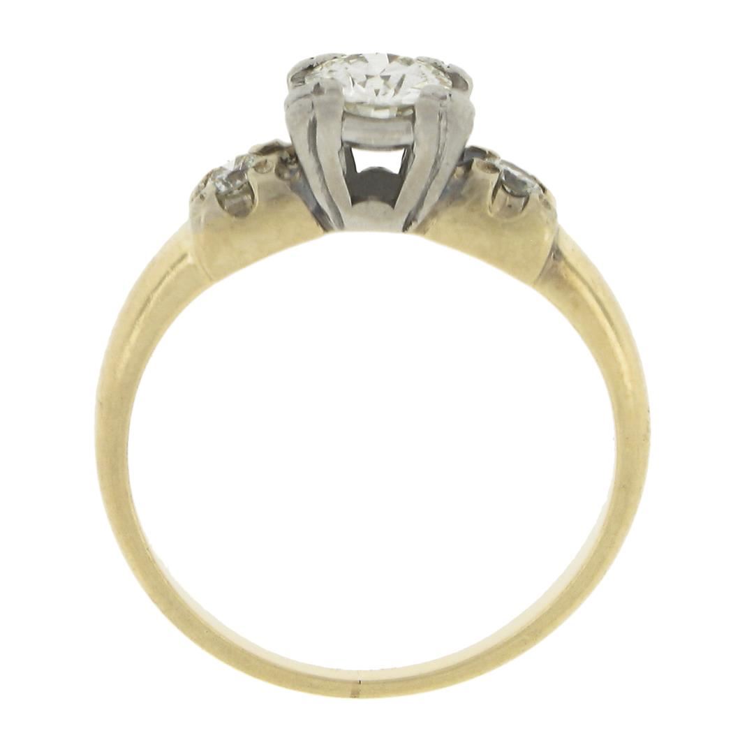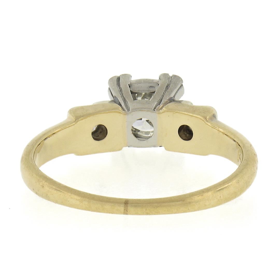 An antique solid 14k yellow gold & palladium engagement ring, with 1 old transitional cut natural diamond (I - VS1 ; 0.50ct), accented with 2 old single cut natural diamonds ( I - VS1/VS2 ; 0.10ctw). The ring is size 5.5, weighs a total of 2.9 grams, and measures 6.4mm wide.