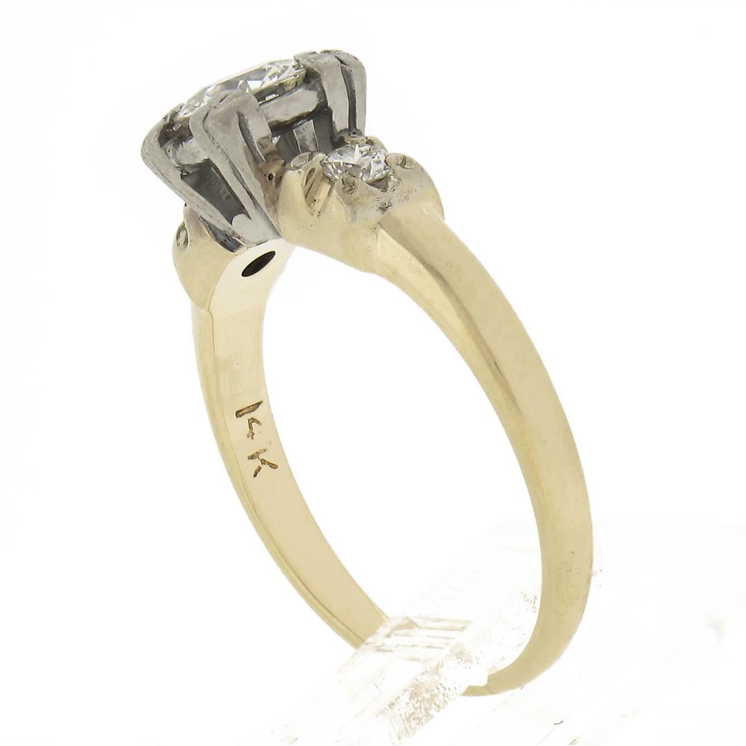 An antique solid 14k yellow gold & palladium engagement ring, with 1 old transitional cut natural diamond (I - VS1 ; 0.50ct), accented with 2 old single cut natural diamonds ( I - VS1/VS2 ; 0.10ctw). The ring is size 5.5, weighs a total of 2.9 grams, and measures 6.4mm wide.