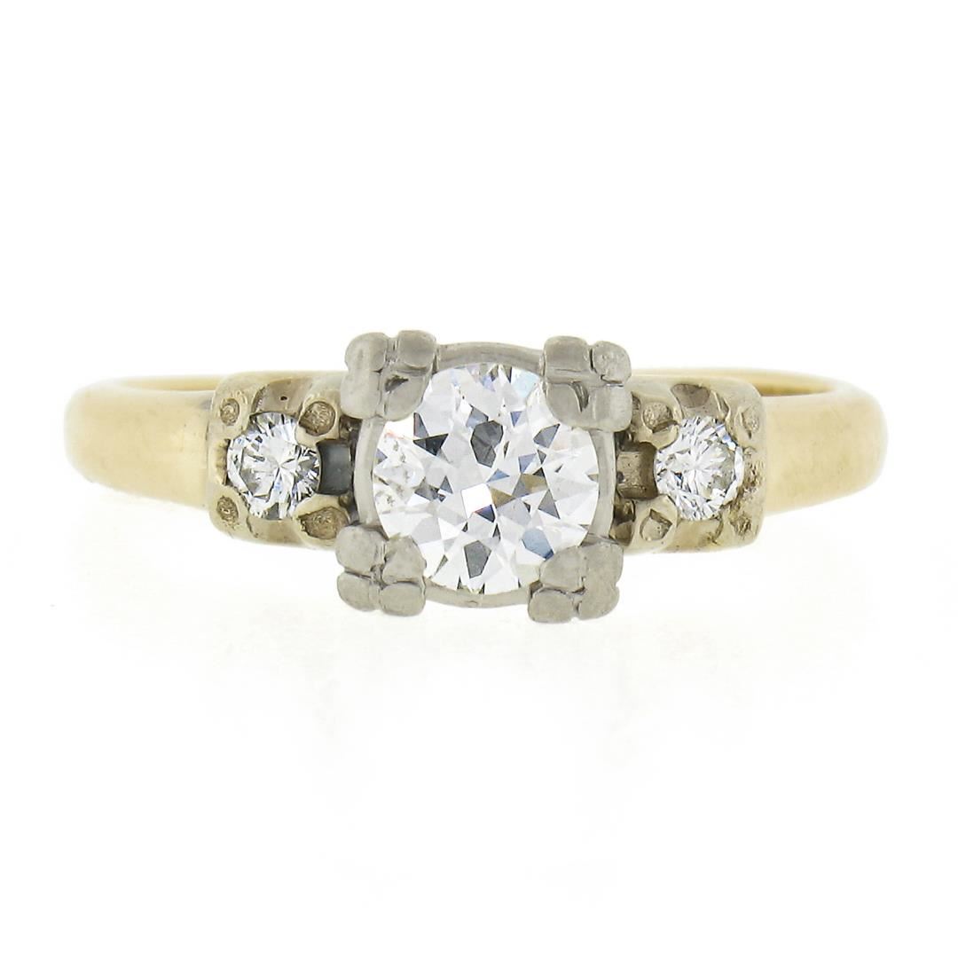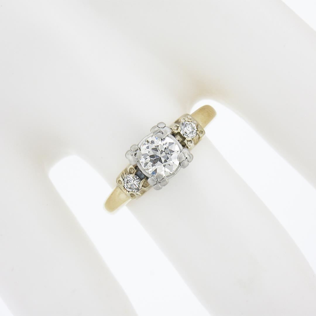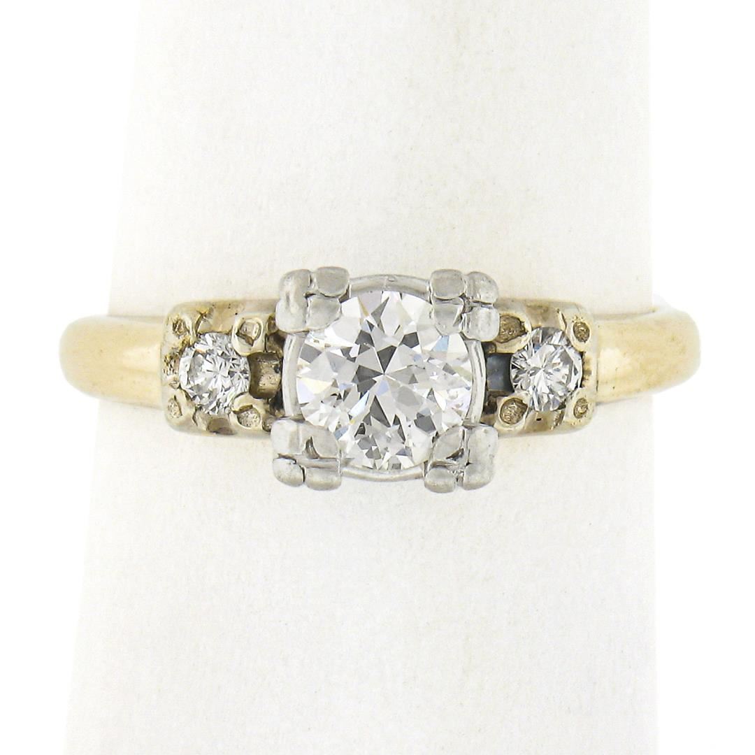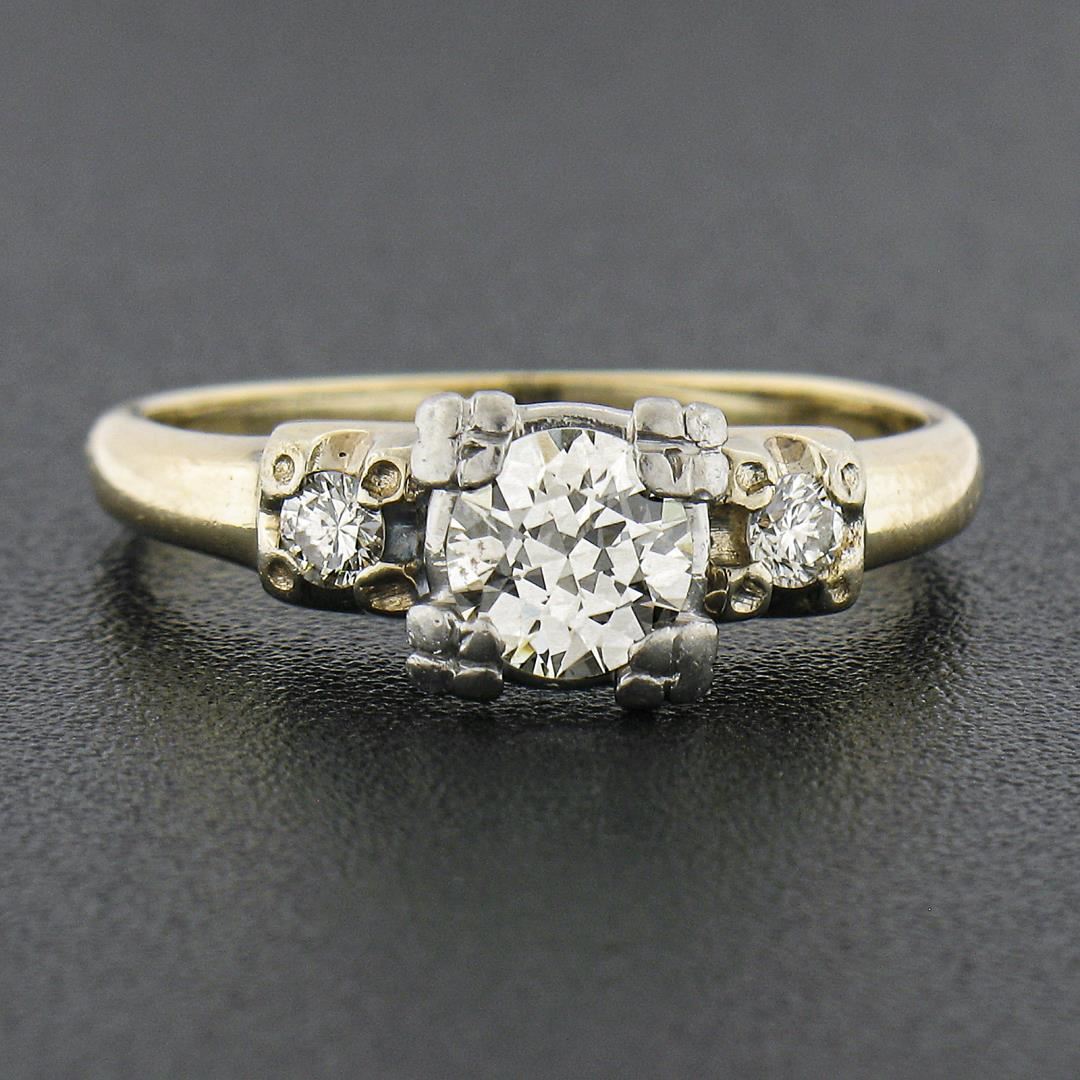 An antique solid 14k yellow gold & palladium engagement ring, with 1 old transitional cut natural diamond (I - VS1 ; 0.50ct), accented with 2 old single cut natural diamonds ( I - VS1/VS2 ; 0.10ctw). The ring is size 5.5, weighs a total of 2.9 grams, and measures 6.4mm wide.