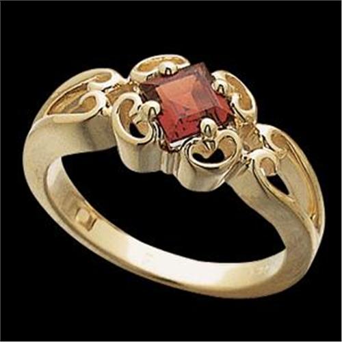Beautiful 14k Yellow Gold ring featuring a Princess Cut MOZAMBIQUE GARNET measuring 5.0MM x 5.0MM surrounded by lovely Gold openwork.