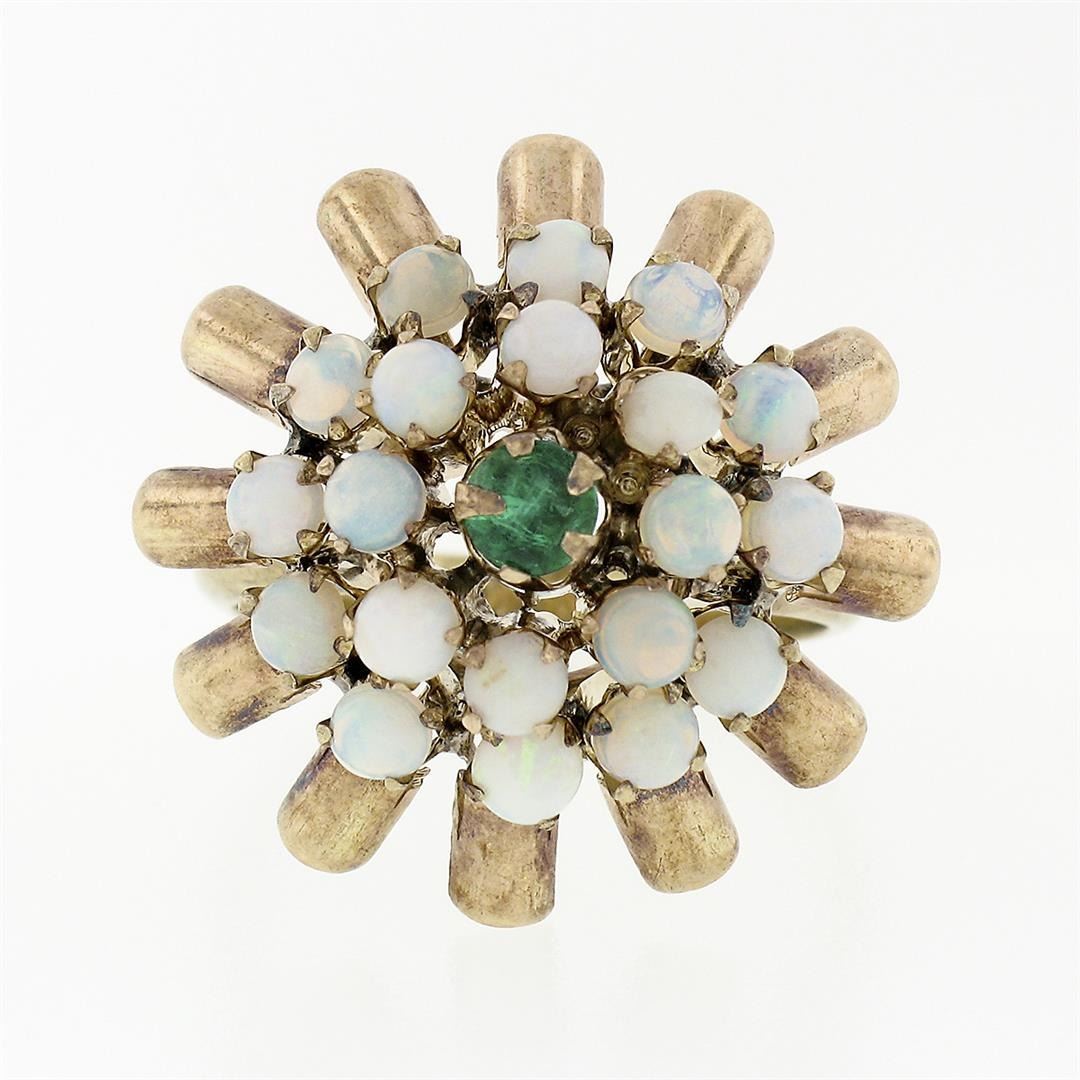 An antique solid 14k rosy yellow gold cluster platter ring, featuring 1 old round cut natural emerald ( 3.55mm - 0.20ctw), surrounded with a halo of 19 round cabochon cut natural opals (2.8mm). The ring is size 7, weighs a total of 4.78 grams, and measures 21.65mm in diameter.