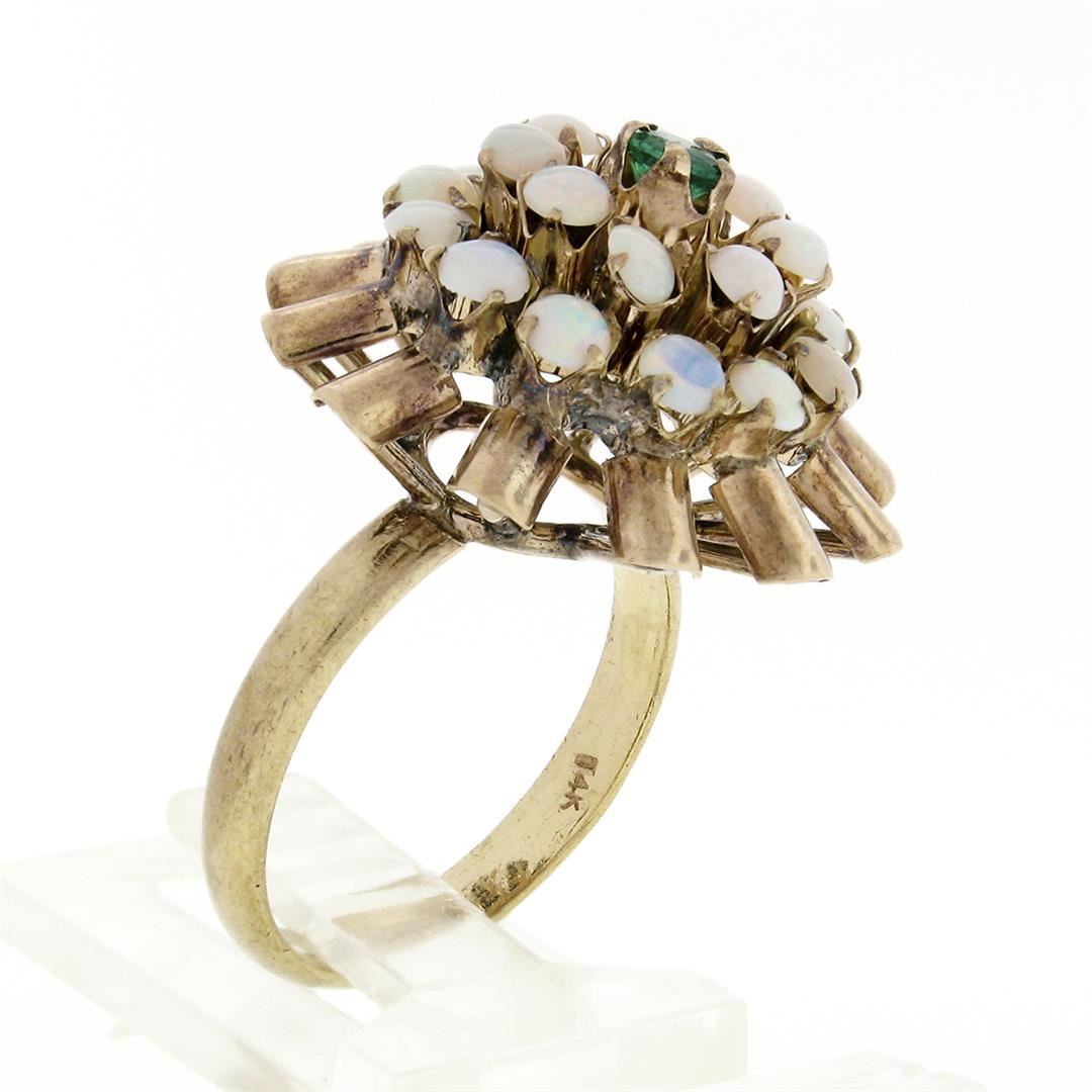 An antique solid 14k rosy yellow gold cluster platter ring, featuring 1 old round cut natural emerald ( 3.55mm - 0.20ctw), surrounded with a halo of 19 round cabochon cut natural opals (2.8mm). The ring is size 7, weighs a total of 4.78 grams, and measures 21.65mm in diameter.