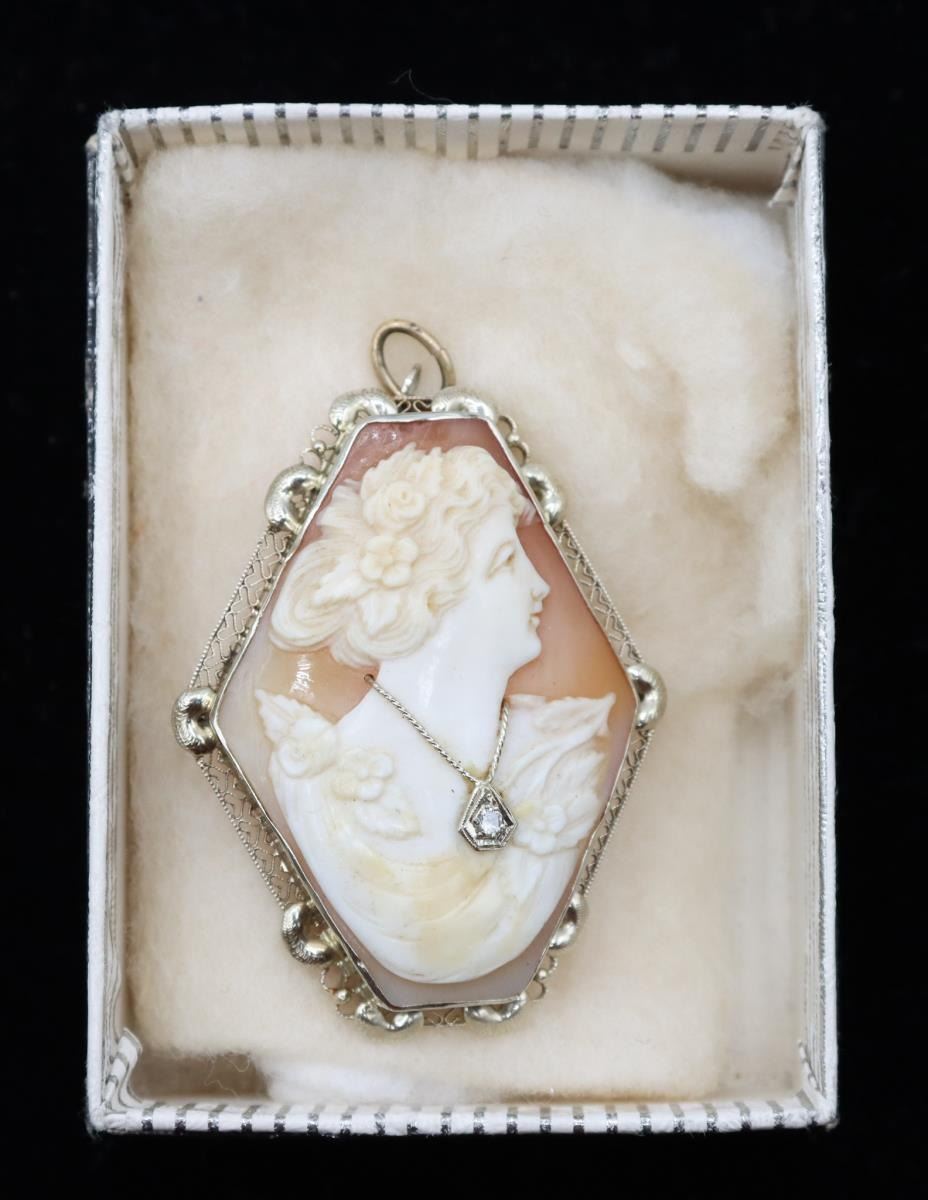 Beautiful cameo of a woman in profile wearing a diamond necklace.