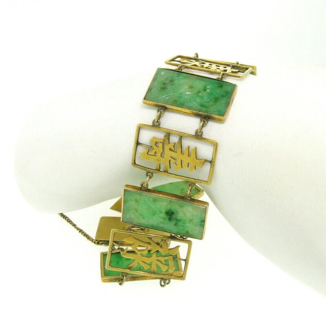 Antique 14k Solid Gold Chinese Large Hand Carved Jade WIDE Link Bracelet. Please see photos and description for all available information. A Vintage solid 14k yellow gold link bracelet, with 6 resctangular carved natural jade (24x12mm). It weighs a total of 21.60 grams, measures 24.25mm wide, and measures 7.25 inches in length.