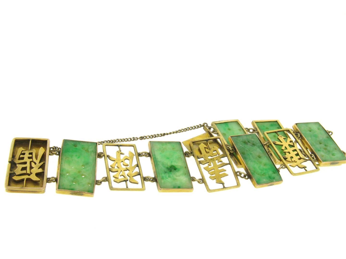 Antique 14k Solid Gold Chinese Large Hand Carved Jade WIDE Link Bracelet. Please see photos and description for all available information. A Vintage solid 14k yellow gold link bracelet, with 6 resctangular carved natural jade (24x12mm). It weighs a total of 21.60 grams, measures 24.25mm wide, and measures 7.25 inches in length.