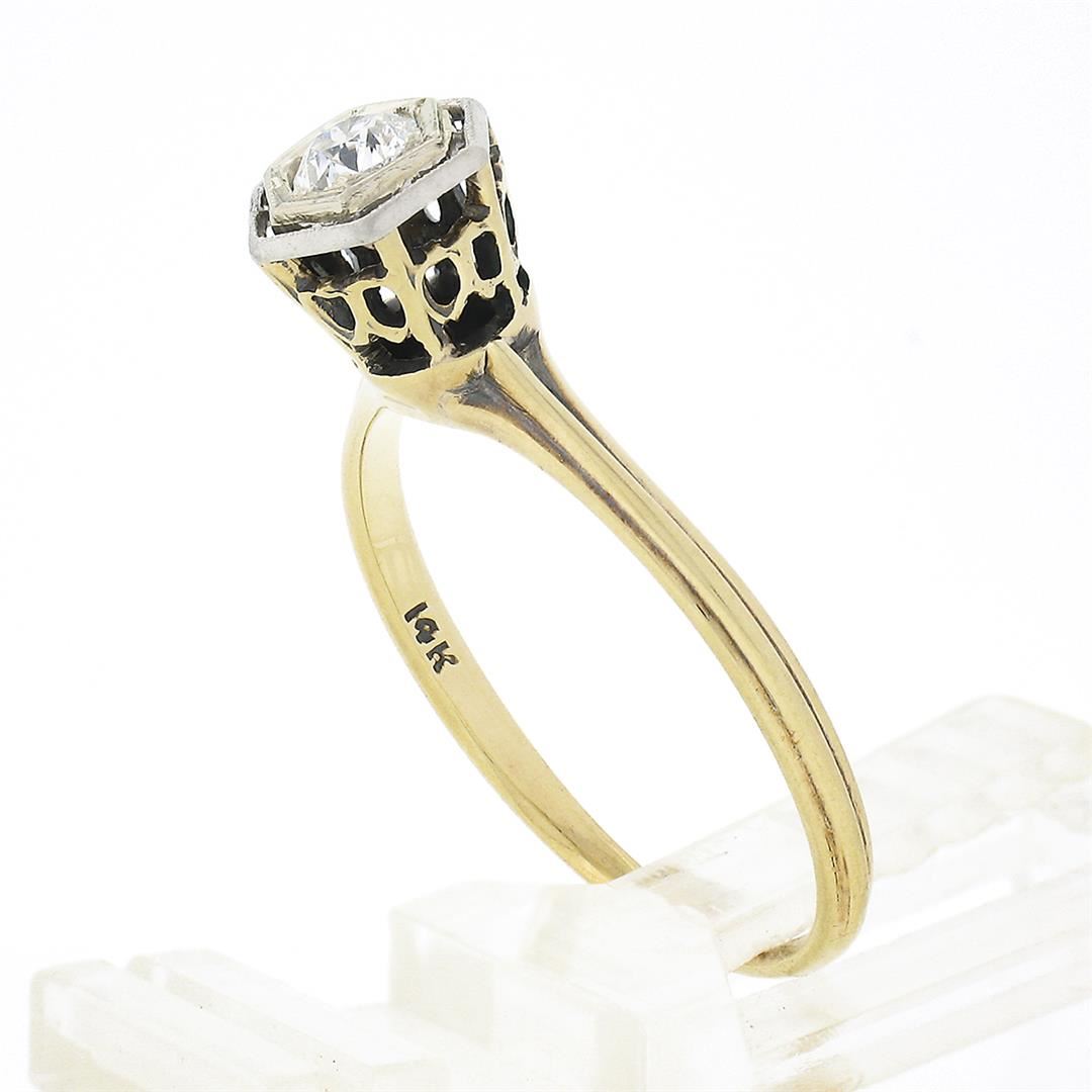 An antique solid 14k yellow and white gold engagement ring, with 1 old European cut natural diamond (H - SI1 ; 0.20ctw). The ring is size 7.5, weighs a total of 2.27 grams, and measures 7.50mm wide.