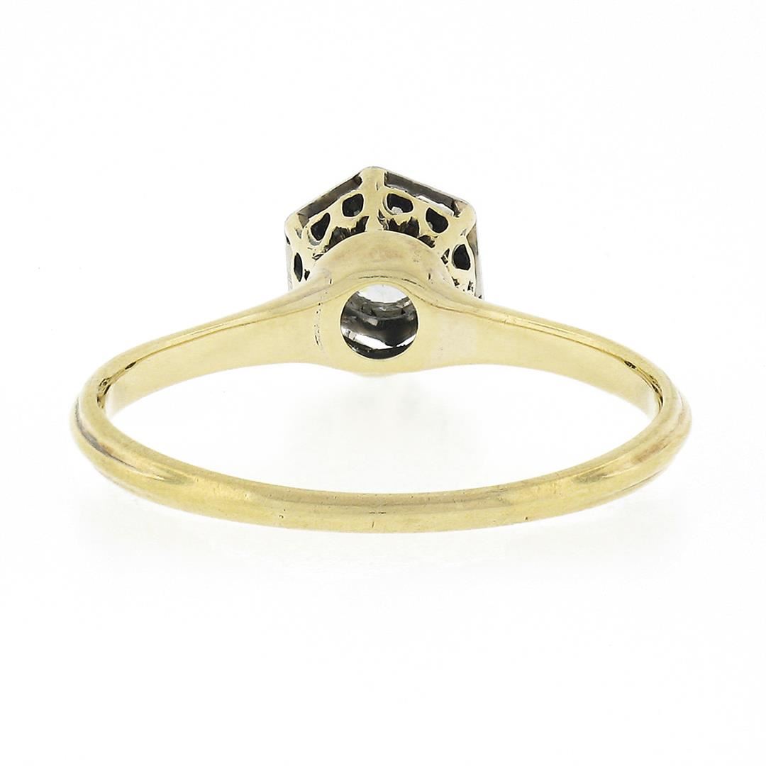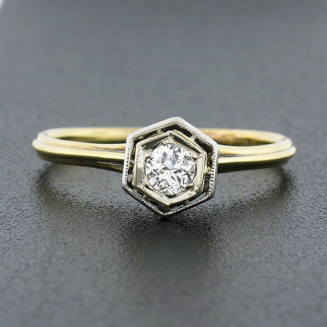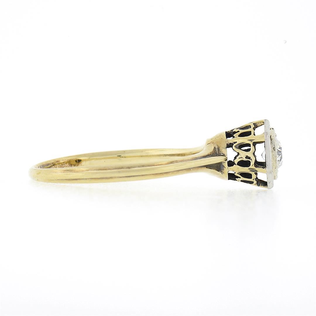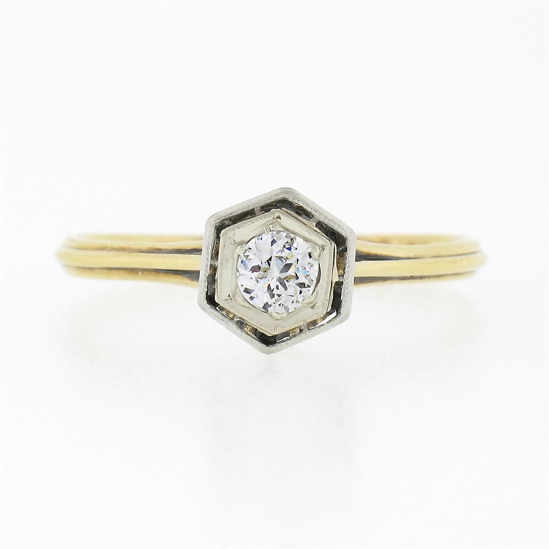 An antique solid 14k yellow and white gold engagement ring, with 1 old European cut natural diamond (H - SI1 ; 0.20ctw). The ring is size 7.5, weighs a total of 2.27 grams, and measures 7.50mm wide.