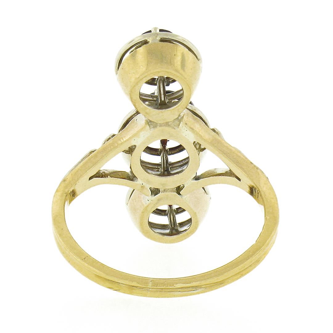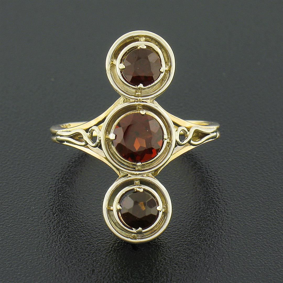 An antique solid 14k two tone gold ring, with 3 old round cut natural garnets (3.8mm/5.0mm/3.8mm - 1.14ctw). The ring is size 4.5, weighs a total of 3.47 grams, and measures 22mm wide.