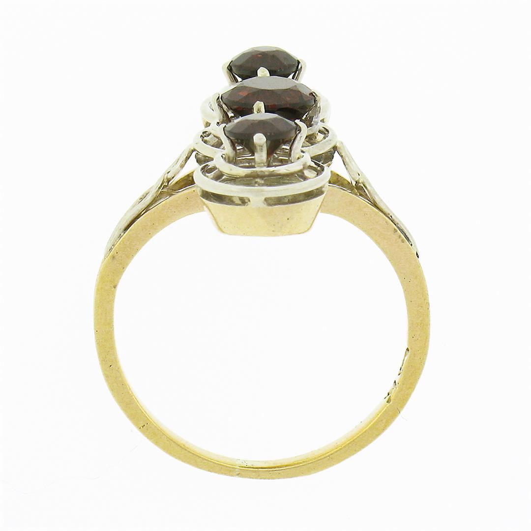 An antique solid 14k two tone gold ring, with 3 old round cut natural garnets (3.8mm/5.0mm/3.8mm - 1.14ctw). The ring is size 4.5, weighs a total of 3.47 grams, and measures 22mm wide.