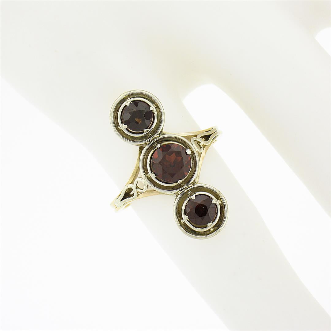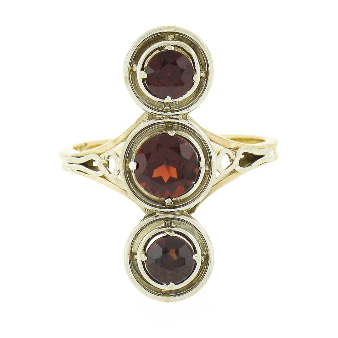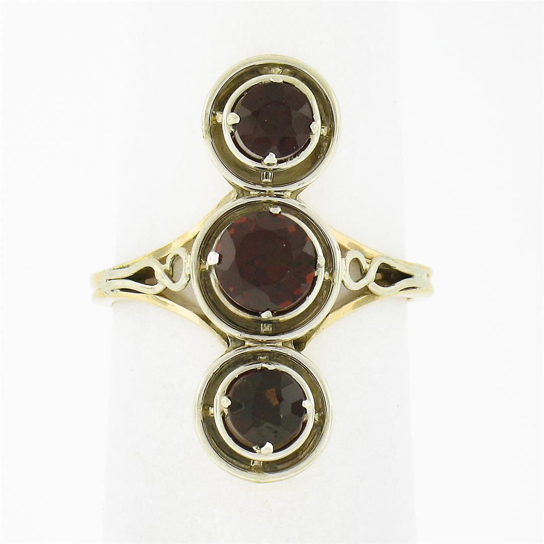 An antique solid 14k two tone gold ring, with 3 old round cut natural garnets (3.8mm/5.0mm/3.8mm - 1.14ctw). The ring is size 4.5, weighs a total of 3.47 grams, and measures 22mm wide.