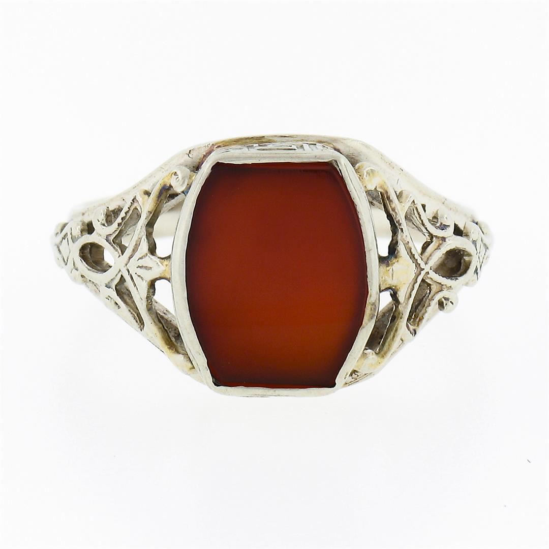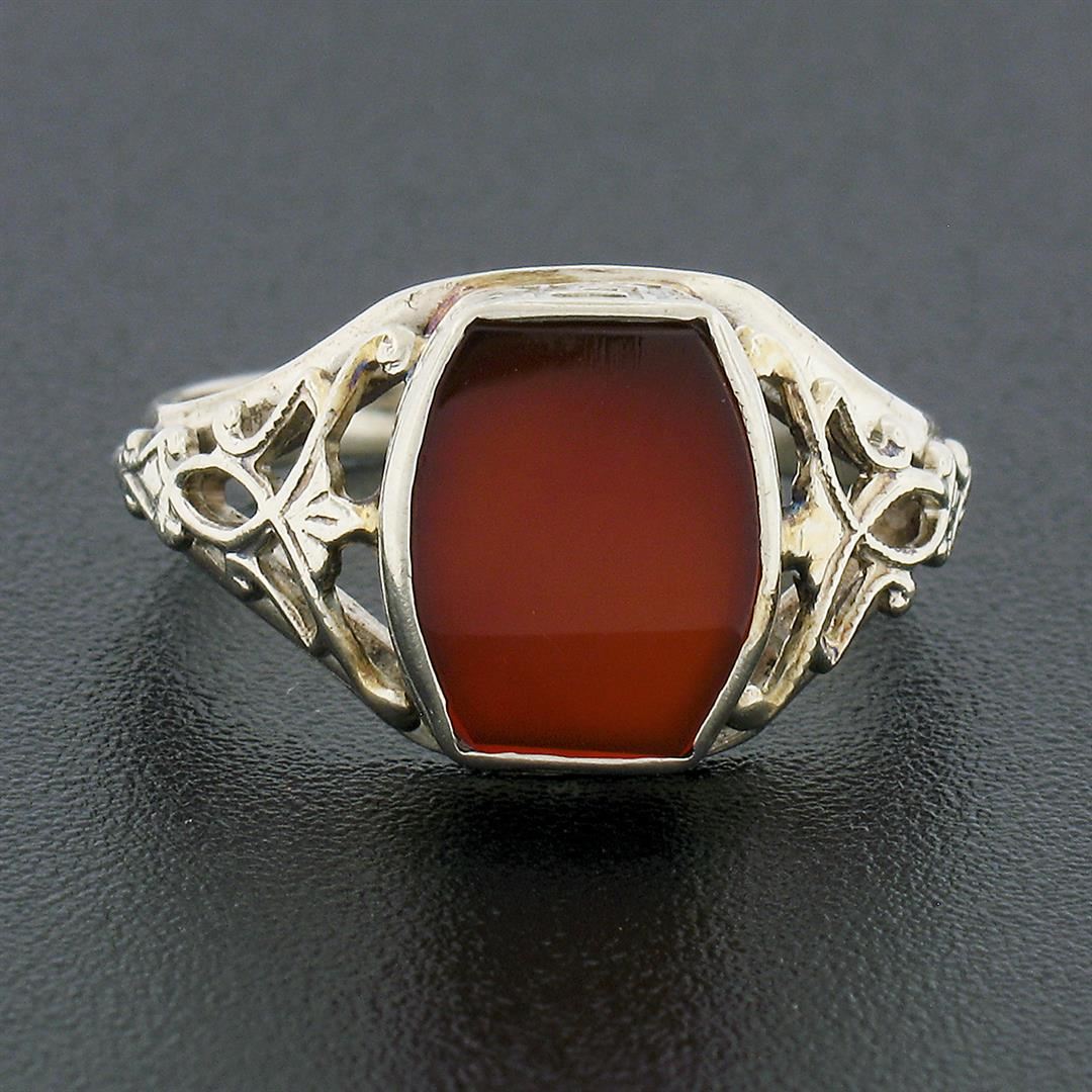 Antique 14k White Gold Bezel Custom Carnelian Solitaire Filigree Open Work Ring