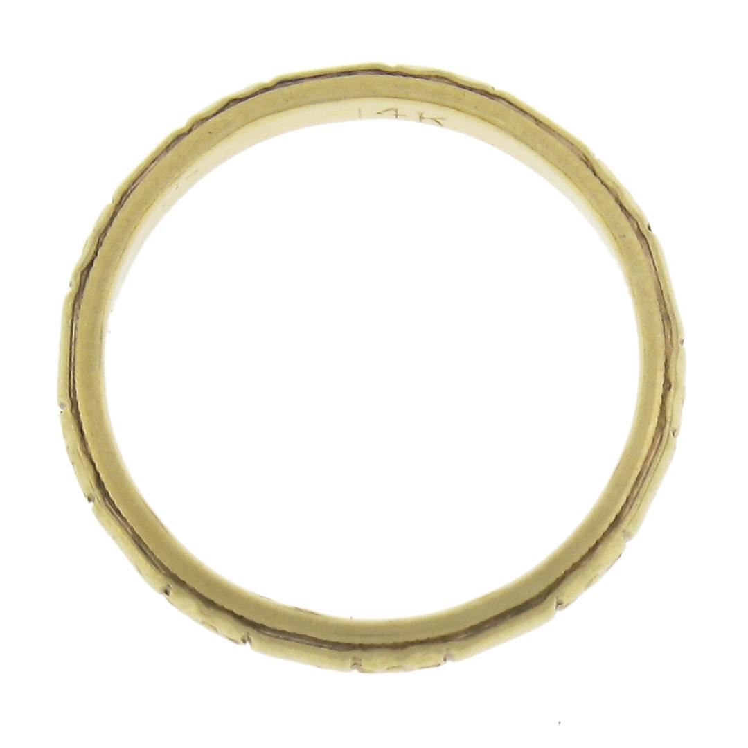 An antique solid 14k yellow gold stack band ring. The ring is size 5.0, weighs a total of 1.79 grams, and measures 2.1mm wide.