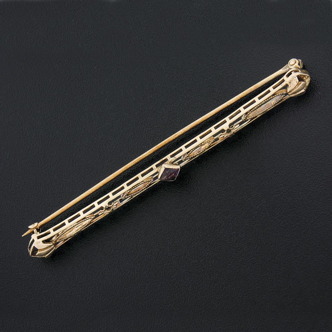 Antique 14k Yellow Gold Square Step Cut Amethyst Open Work Design Bar Pin Brooch