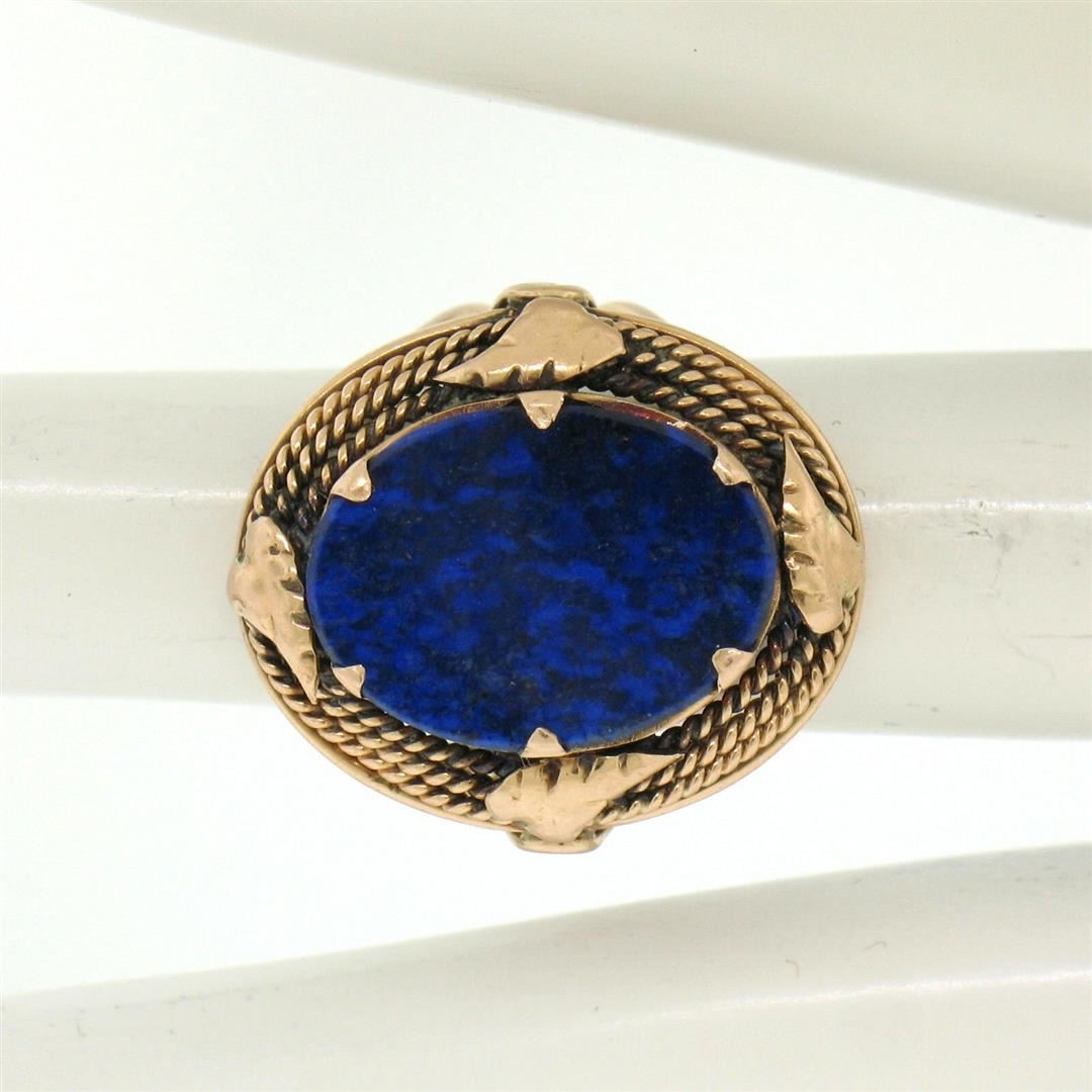 An excellent condition antique 14kt rose gold ring with a 16.0x12.25mm oval disk cut lapis prong set within a leaf and twisted gold wire frame. The ring is size 4, weighs a total of 5.4 grams, and measures 22.08mm wide.