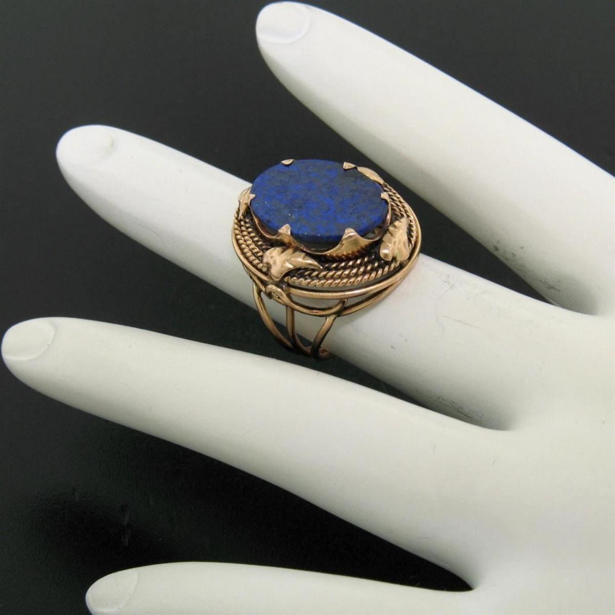 An excellent condition antique 14kt rose gold ring with a 16.0x12.25mm oval disk cut lapis prong set within a leaf and twisted gold wire frame. The ring is size 4, weighs a total of 5.4 grams, and measures 22.08mm wide.