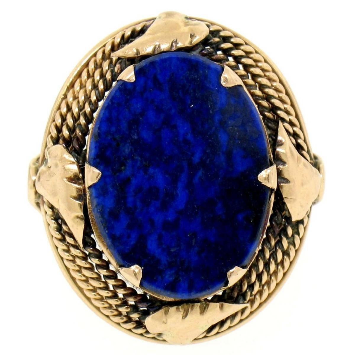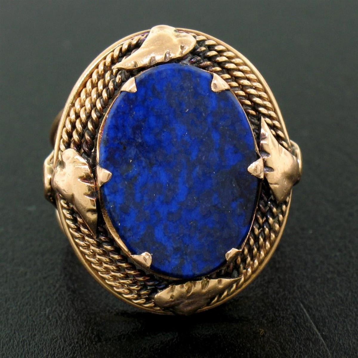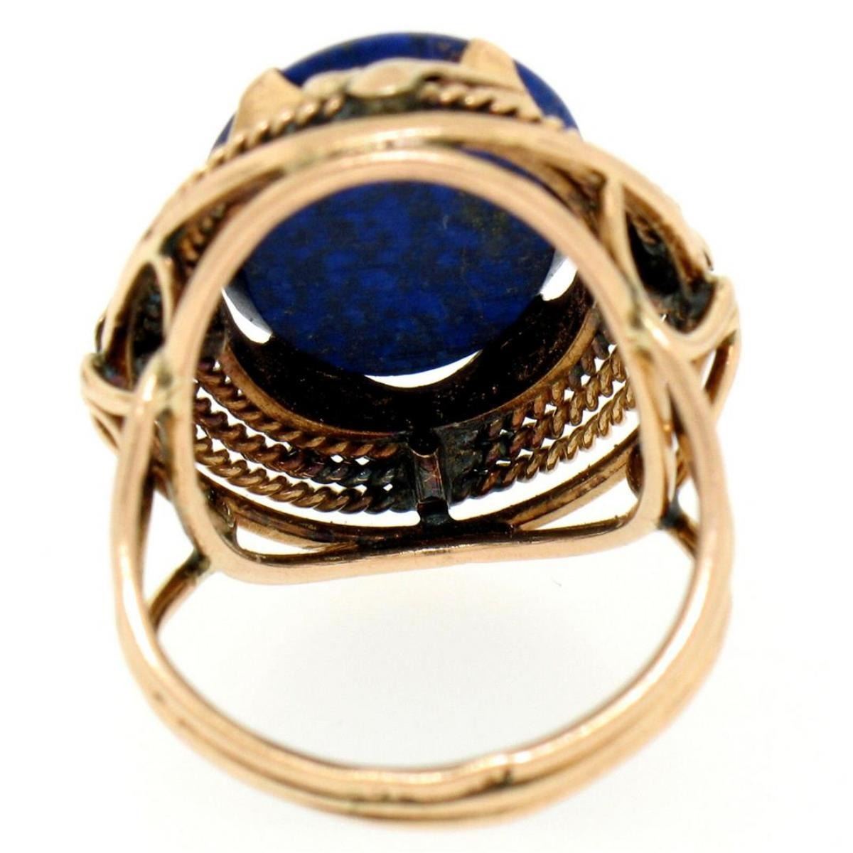 An excellent condition antique 14kt rose gold ring with a 16.0x12.25mm oval disk cut lapis prong set within a leaf and twisted gold wire frame. The ring is size 4, weighs a total of 5.4 grams, and measures 22.08mm wide.