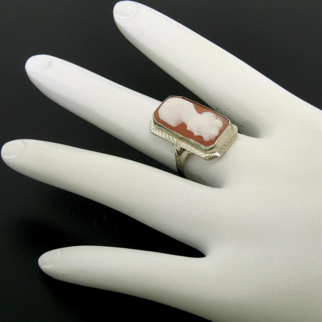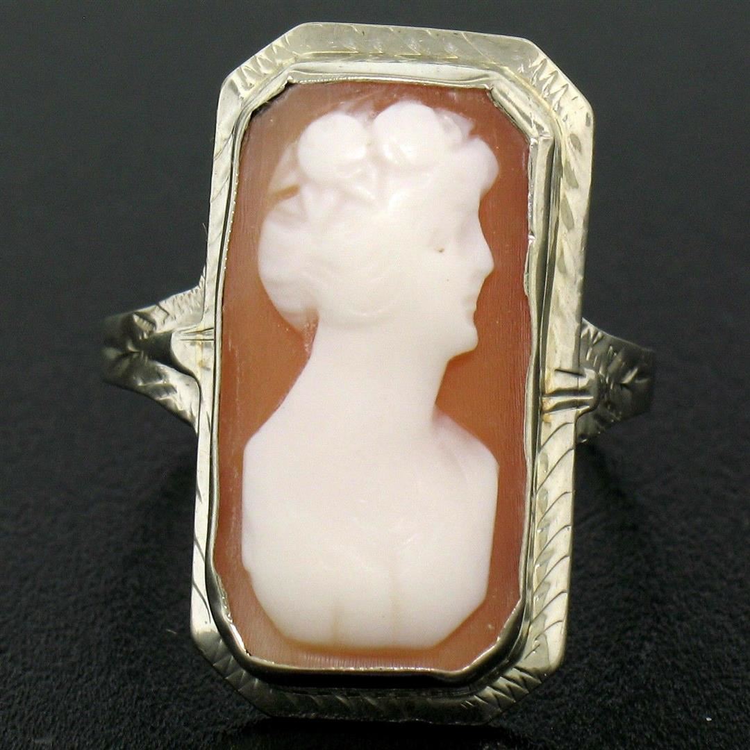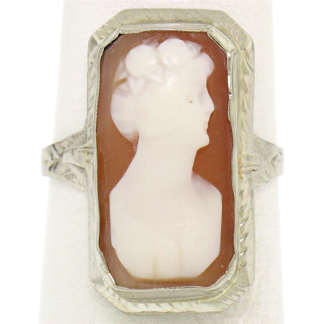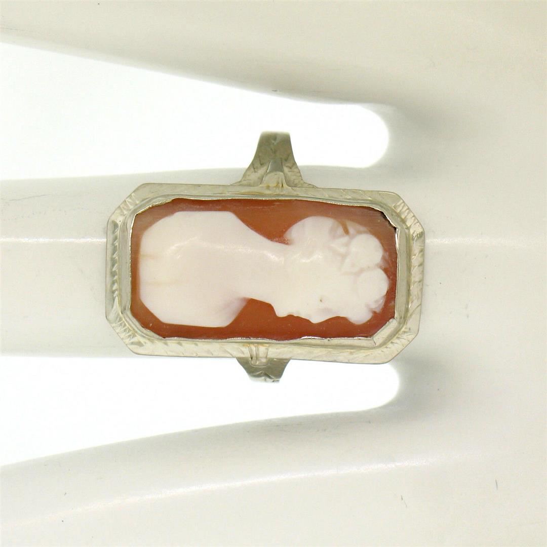 An excellent condition antique 14kt white gold ring with a carved shell cameo. The ring is size 6.5, weighs a total of 3.3 grams, and measures 22.0mm wide.
