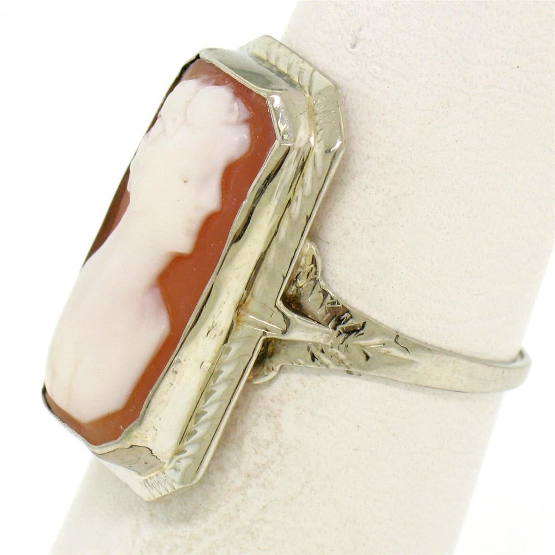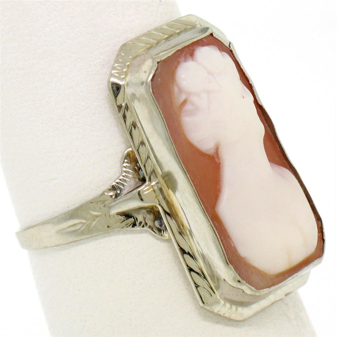 An excellent condition antique 14kt white gold ring with a carved shell cameo. The ring is size 6.5, weighs a total of 3.3 grams, and measures 22.0mm wide.