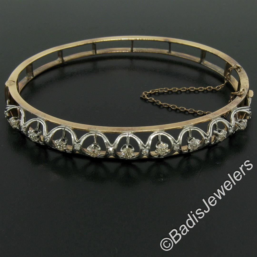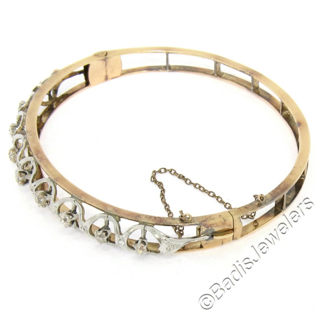An antique 14kt yellow gold and platinum bangle bracelet with 1.00ctw of old mine and single cut diamonds (G to I - VS1/SI1). It weighs a total of 13.79 grams, measures 8.4mm wide, and measures 7.5 inches in length.