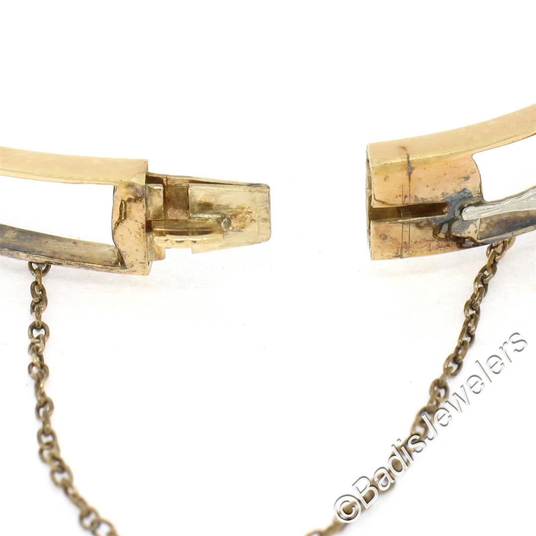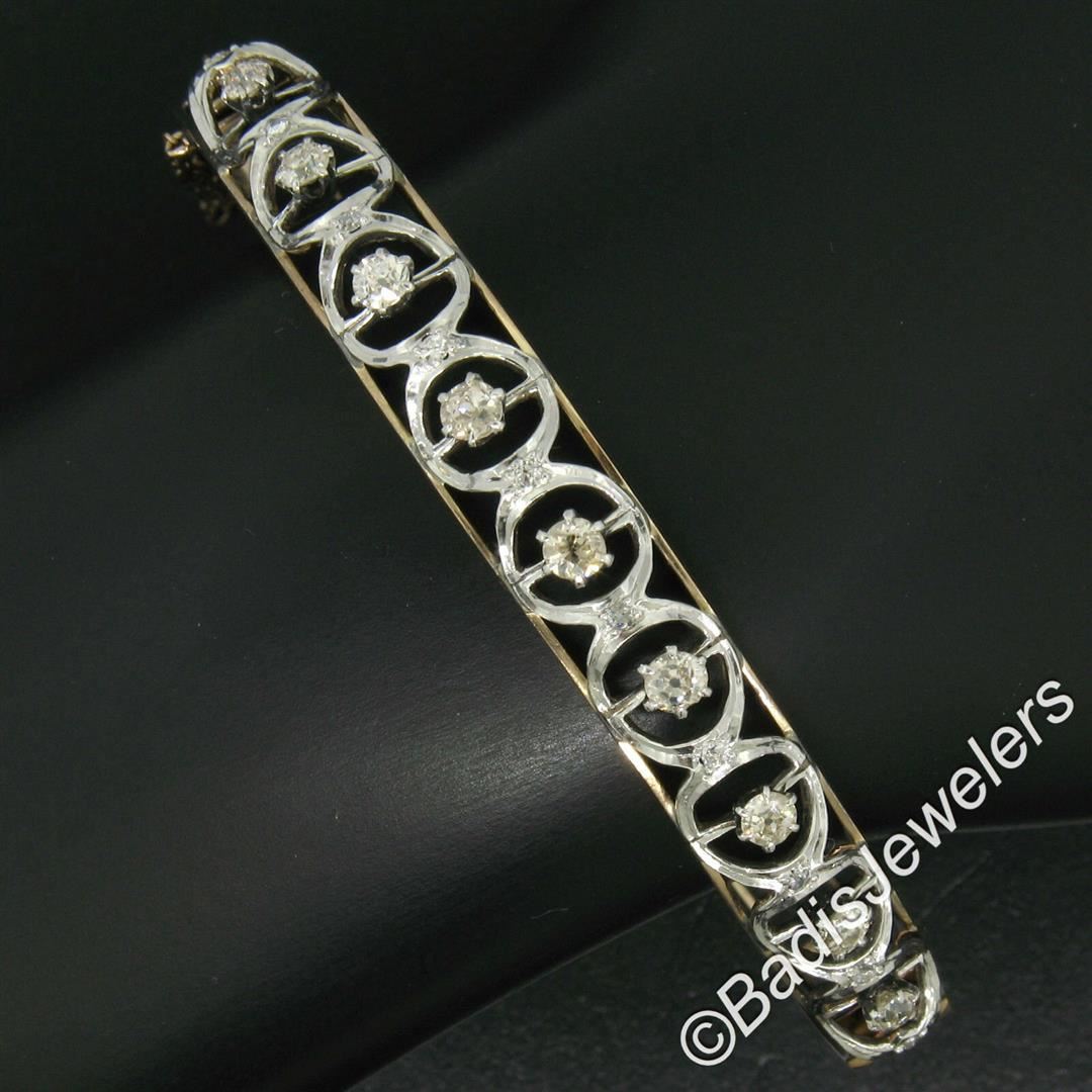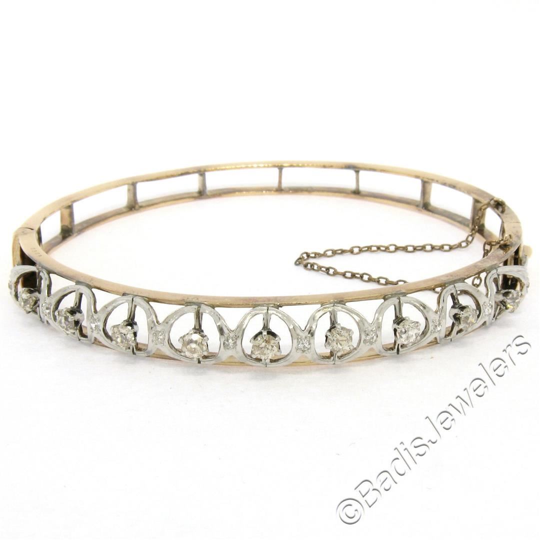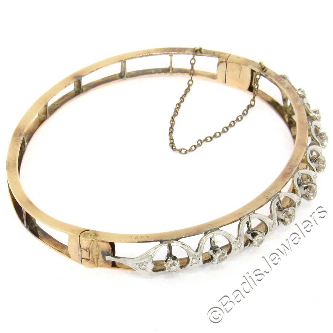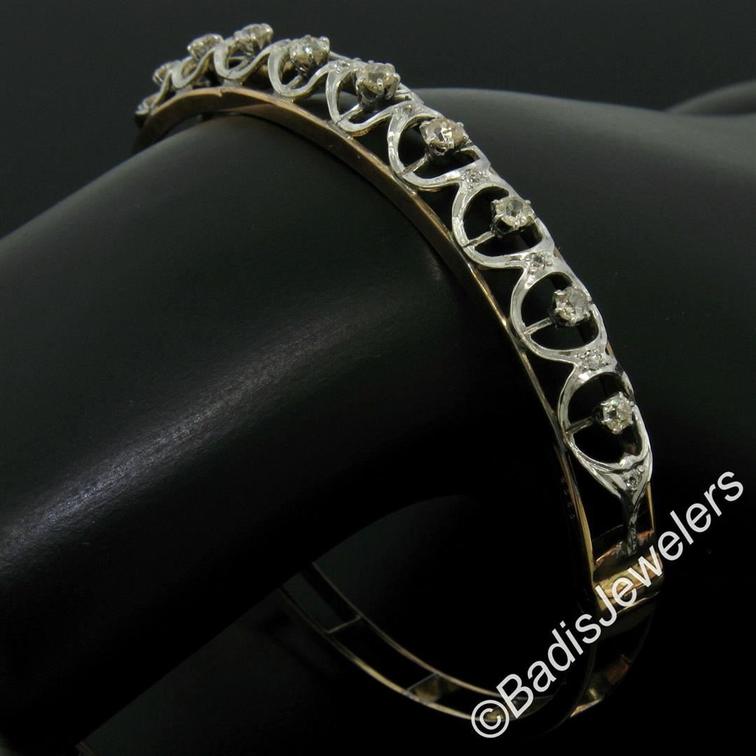 An antique 14kt yellow gold and platinum bangle bracelet with 1.00ctw of old mine and single cut diamonds (G to I - VS1/SI1). It weighs a total of 13.79 grams, measures 8.4mm wide, and measures 7.5 inches in length.