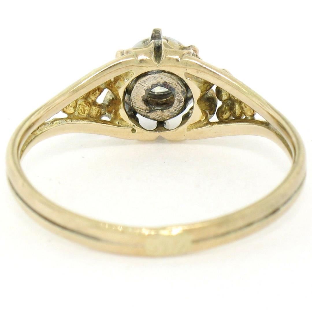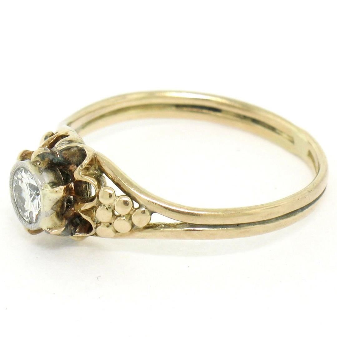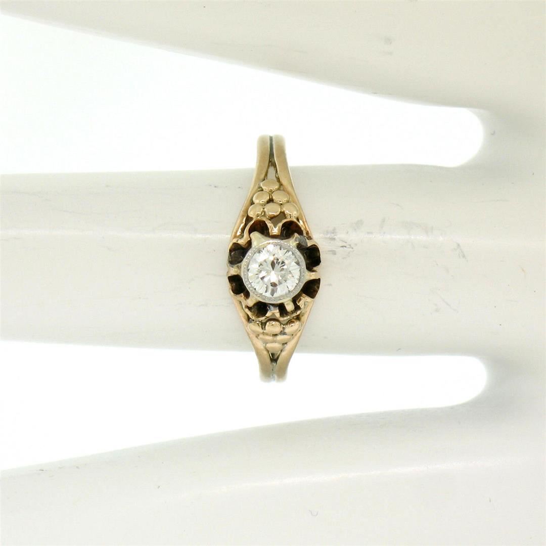 An antique 14kt yellow gold ring featuring a 0.30ct round brilliant diamond (F - VVS2) set in a 14kt white gold milgrain bezel. The ring is size 5.5, weighs a total of 1.79 grams, and measures 6.67mm wide.