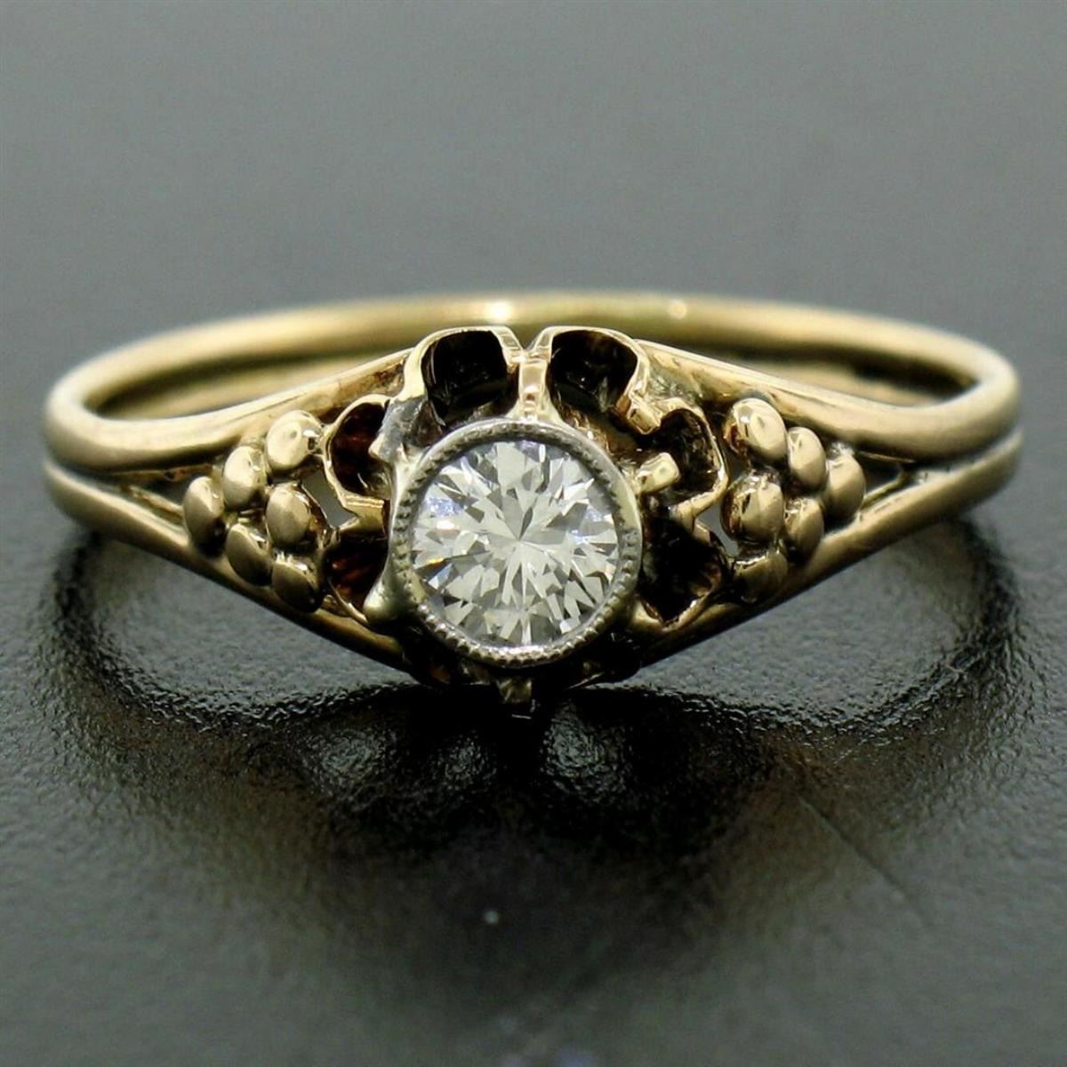 An antique 14kt yellow gold ring featuring a 0.30 ct round brilliant diamond (F - VVS2) set in a 14kt white gold milgrain bezel. The ring is size 5.5, weighs a total of 1.79 grams, and measures 6.67mm wide.