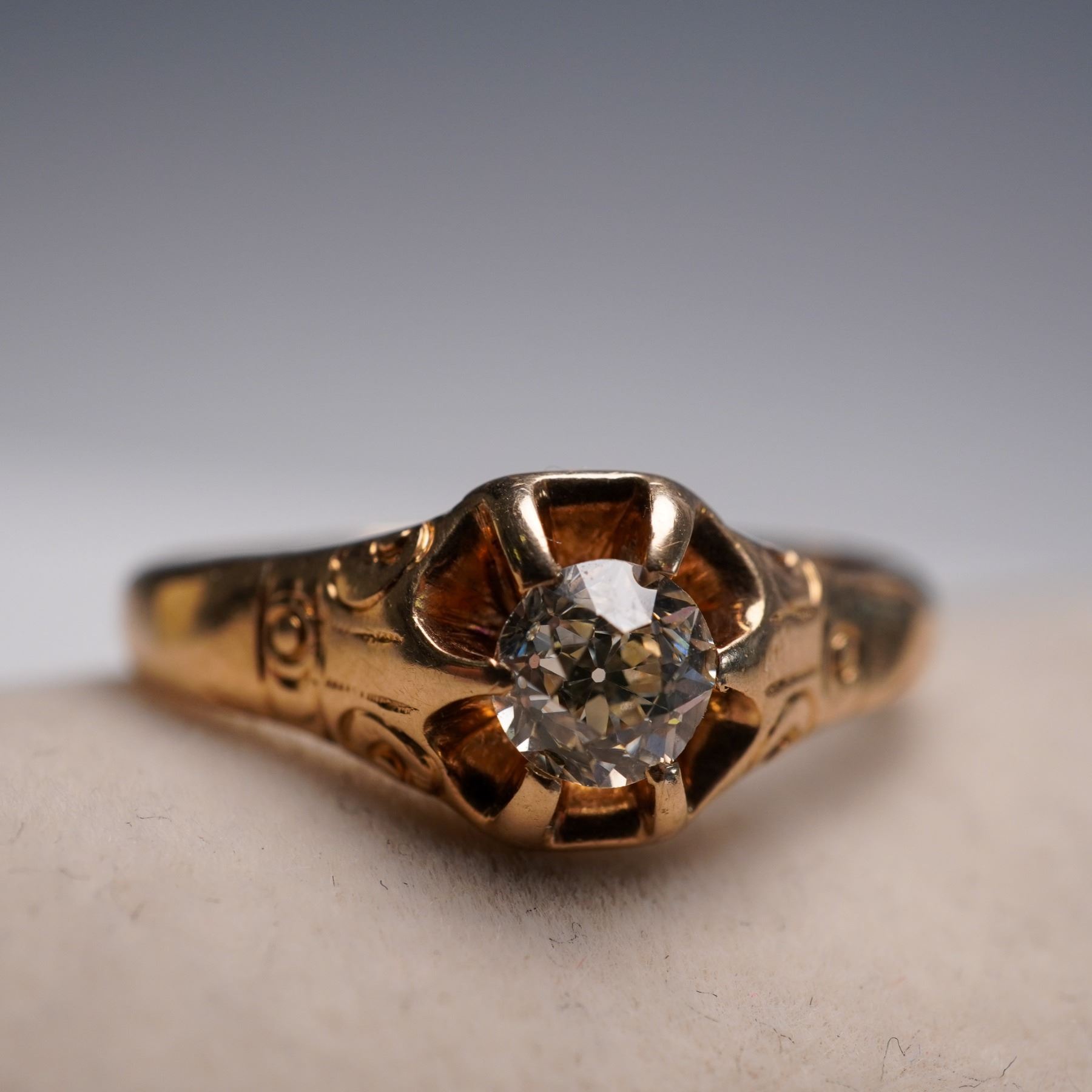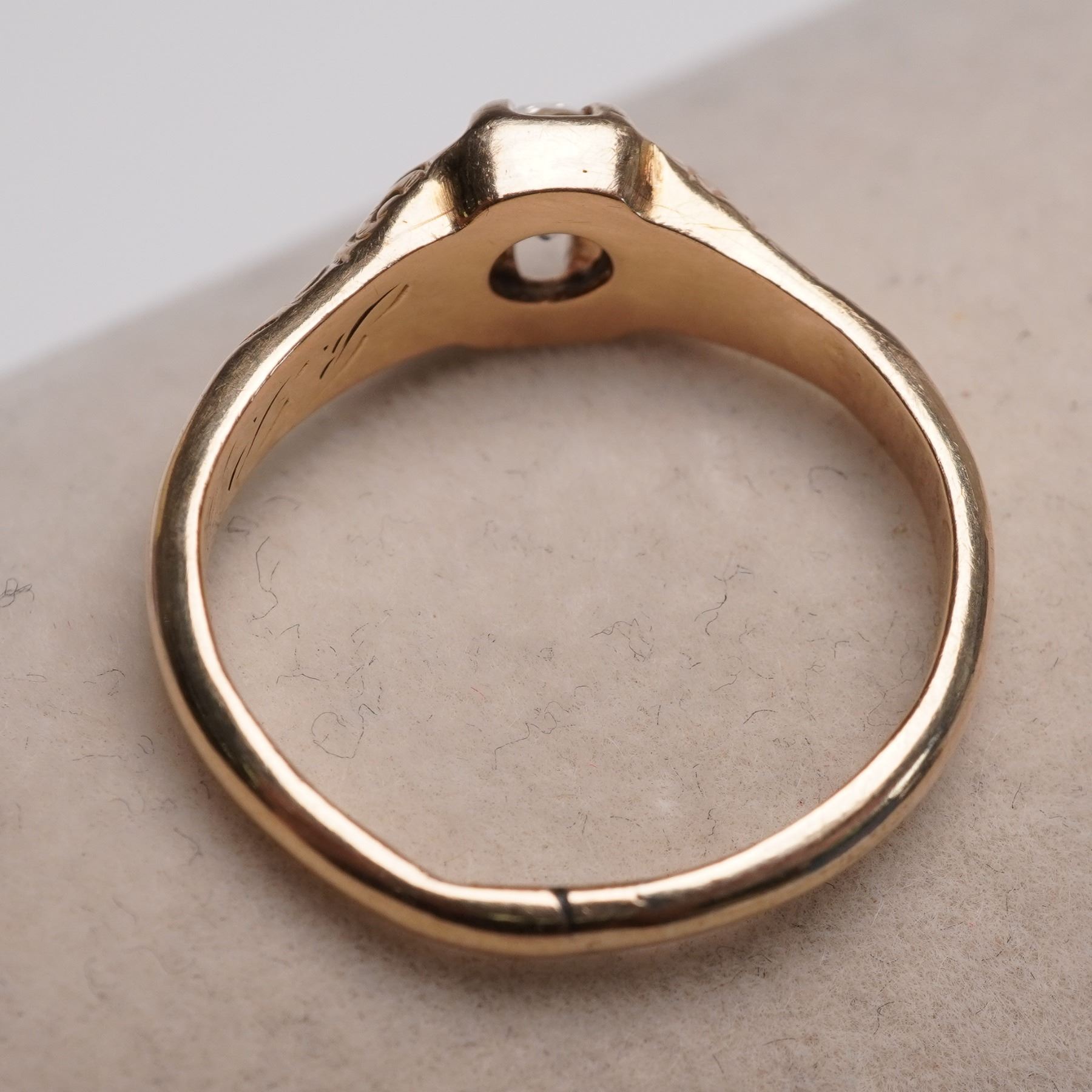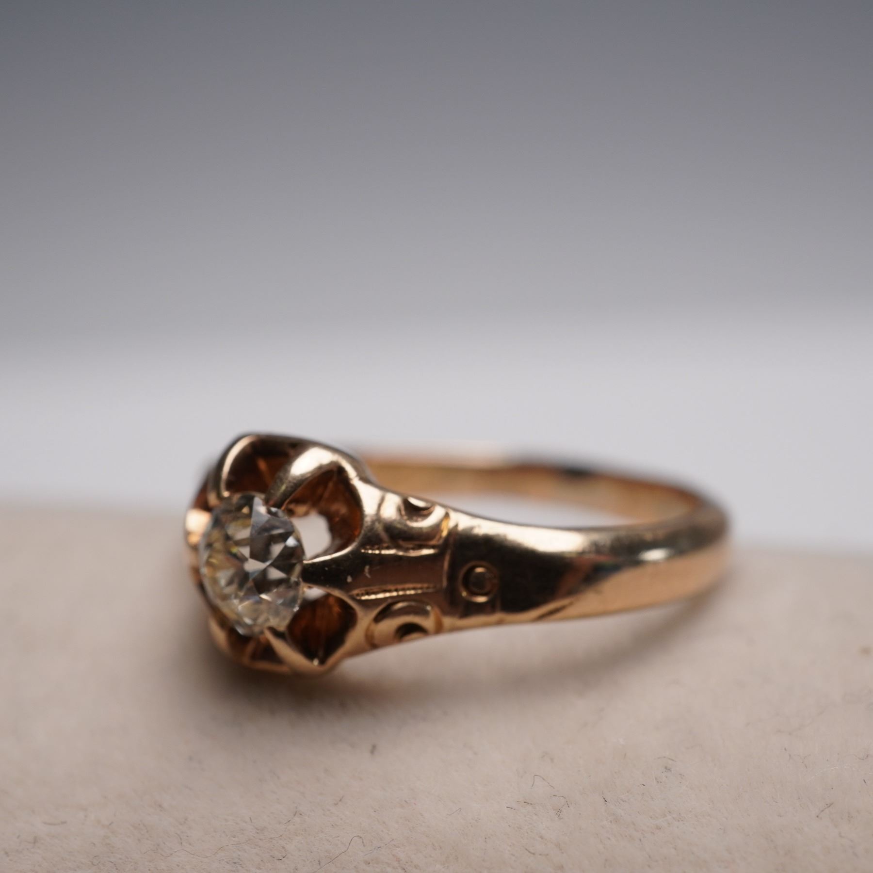 Finely crafted in 16K gold (tests between 14K and 18K), this antique solitaire ring features a bright round-cut diamond set in an ornate floral-style claw setting. The shoulders of the band are delicately engraved with scroll and circle motifs, enhancing its vintage charm and artisanal character. A personal engraving is inscribed inside the band, adding a meaningful, intimate touch to this heirloom piece. The diamond is elevated to catch the light, making this ring both a sentimental keepsake and a striking statement of historical elegance.