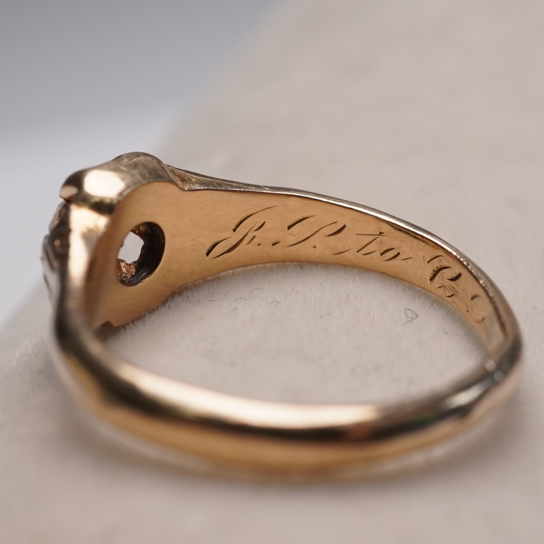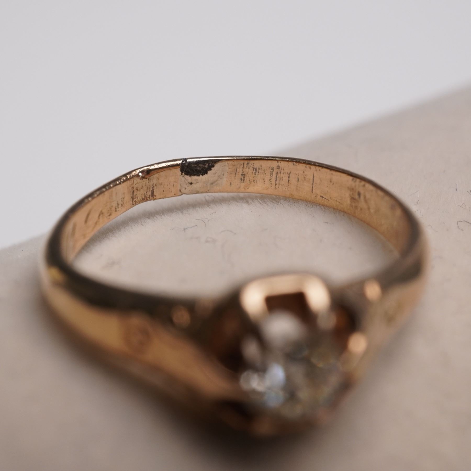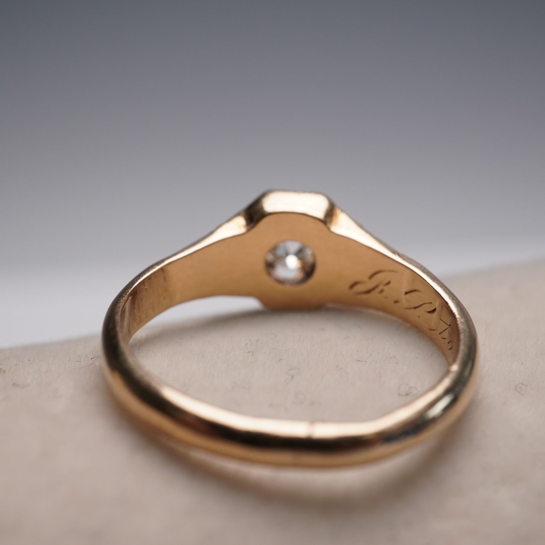 Finely crafted in 16K gold (tests between 14K and 18K), this antique solitaire ring features a bright round-cut diamond set in an ornate floral-style claw setting. The shoulders of the band are delicately engraved with scroll and circle motifs, enhancing its vintage charm and artisanal character. A personal engraving is inscribed inside the band, adding a meaningful, intimate touch to this heirloom piece. The diamond is elevated to catch the light, making this ring both a sentimental keepsake and a striking statement of historical elegance.