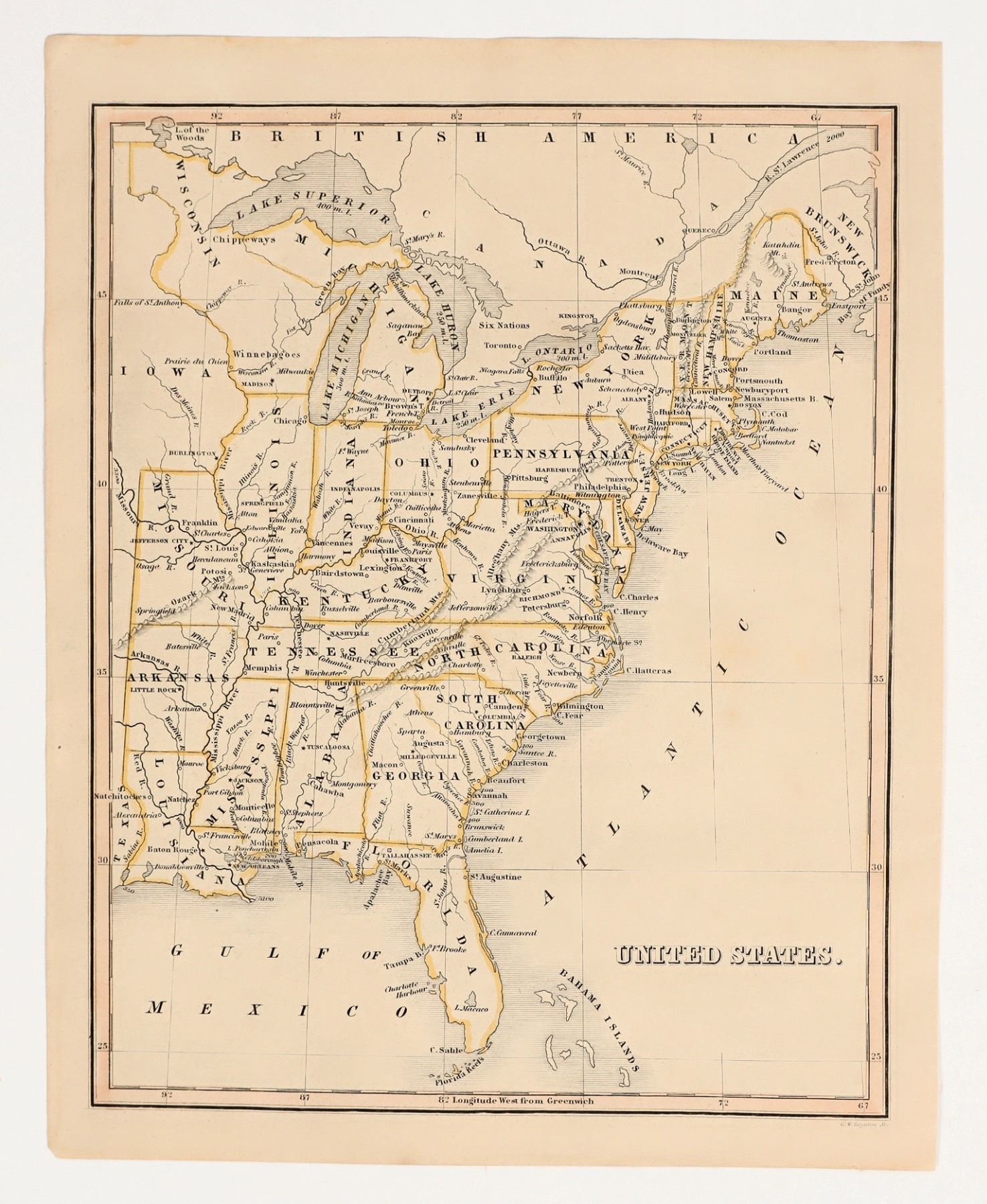 1843 map by GW Boynton, published in Boston. Shows the eastern and southern US from Iowa eastward. Just before the Gold Rush. 11.5 x 9" Boynton engraved maps for various publishers incl. Thomas Bradford, Nathaniel Dearborn, Daniel Adams & SG Goodrich.