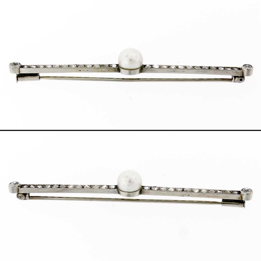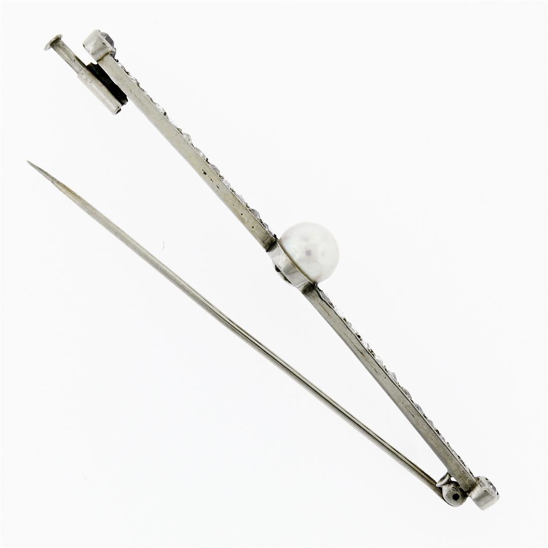 Antique 18K Gold 1.10ctw Rose & Old Mine Diamond & Pearl Milgrain Bar Pin Brooch. An antique solid 18k white gold bar pin featuring a round genuine cultured pearl (7.0mm) accented by 24 pave set rose cut diamonds (0.90ctw) and 2 bezel set old mine cut dia
