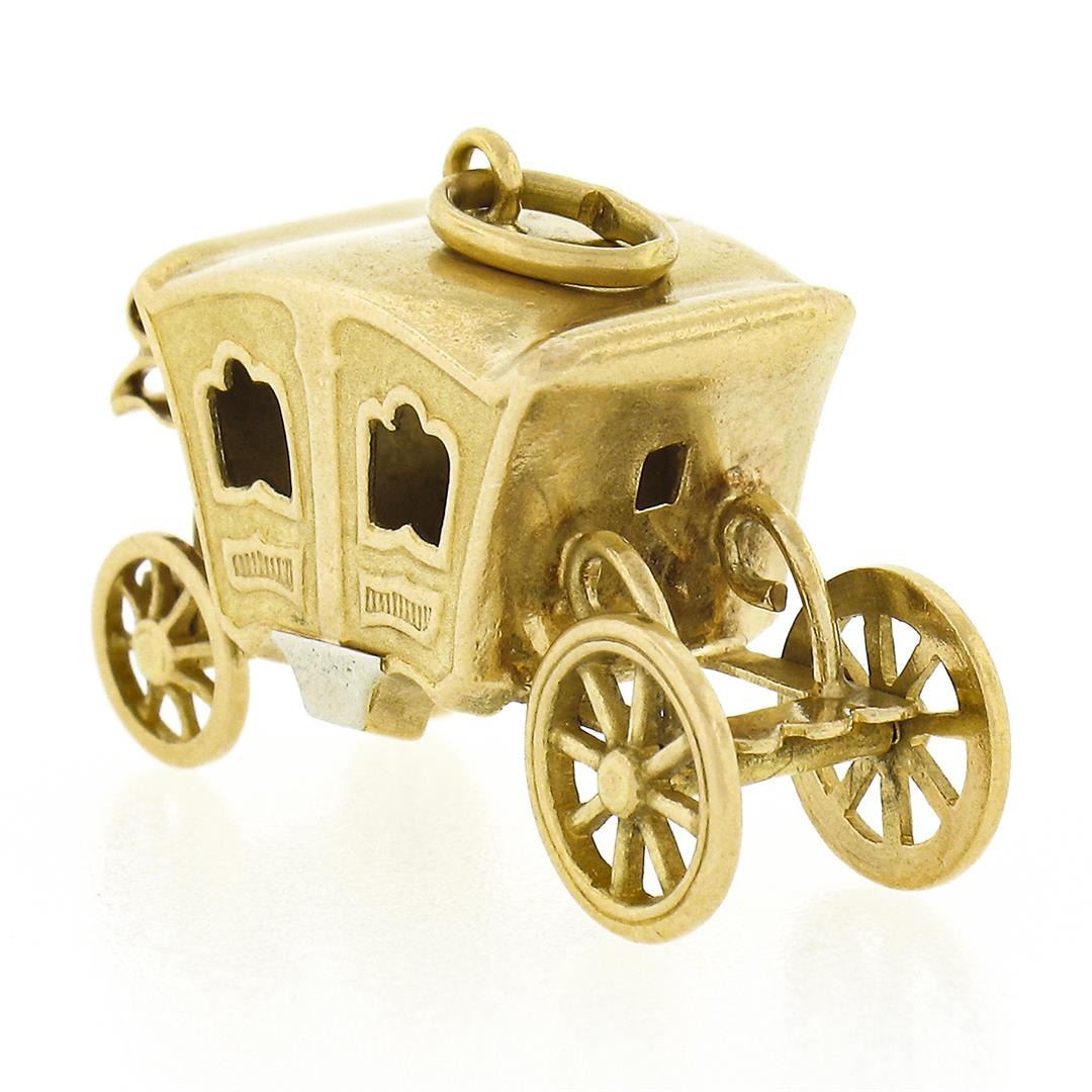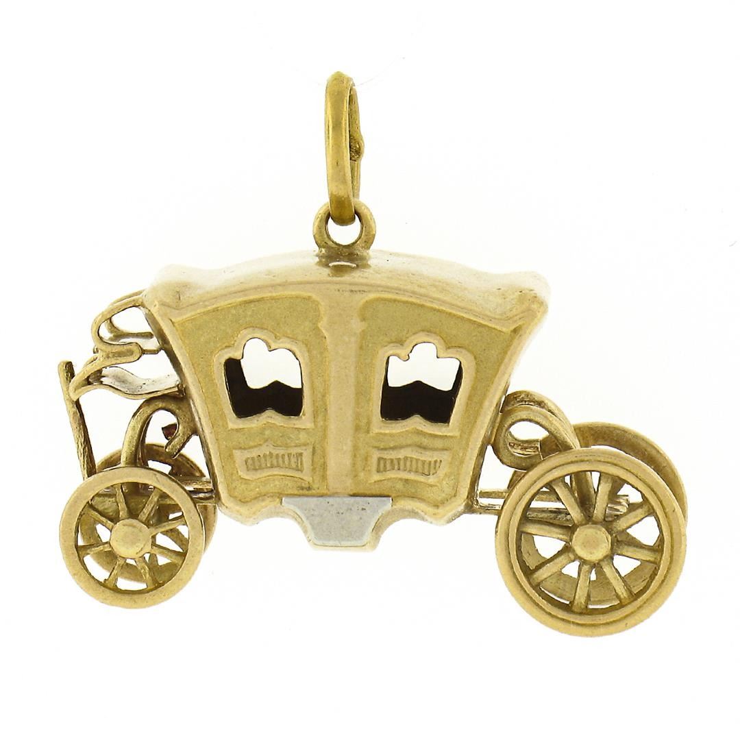 An antique solid 18k yellow gold coach carriage charm pendant. The pendant weighs a total of 4.89 grams, measures 21.90mx25.45mm including the bail, and the inside of the bail measures 3.0x5.0mm.