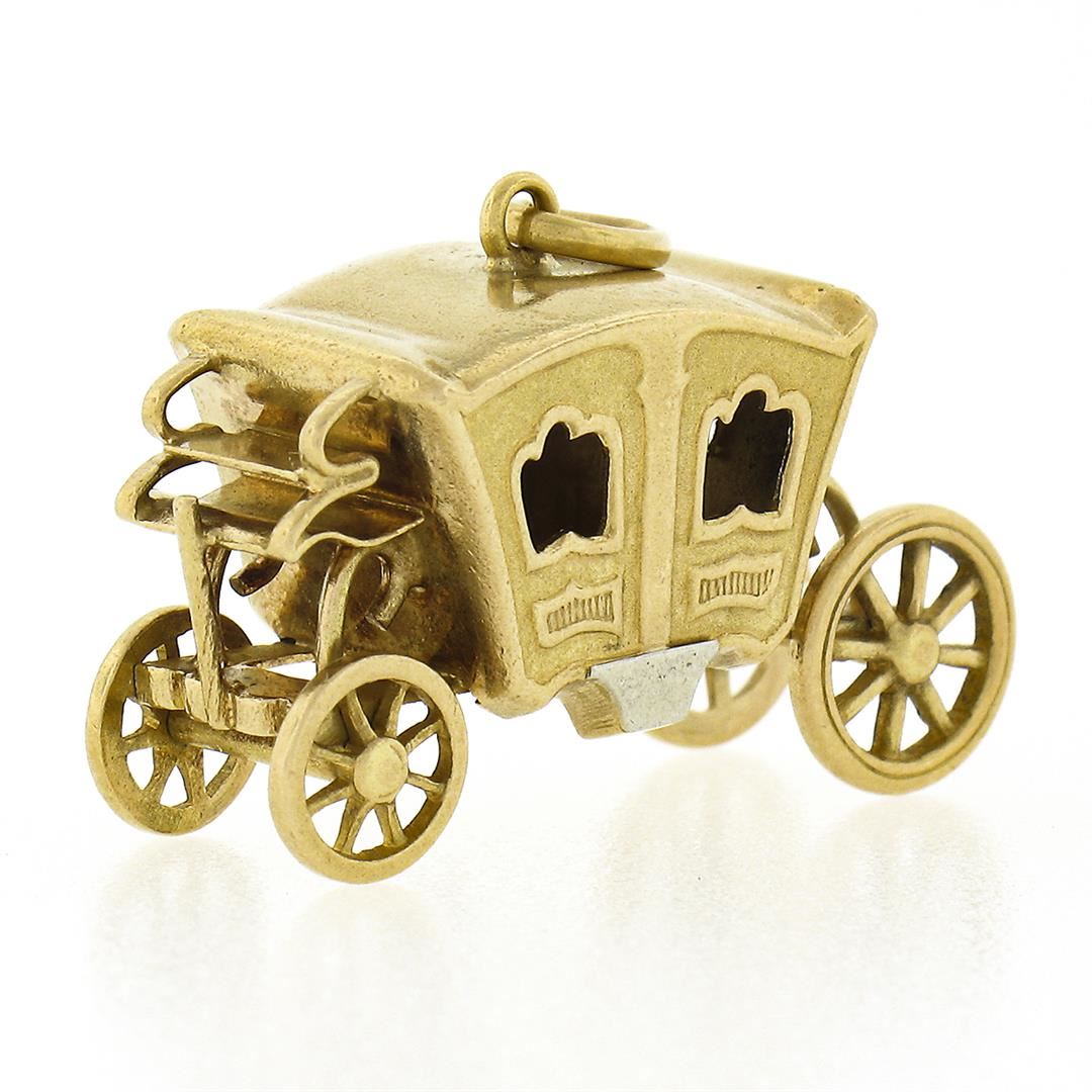 An antique solid 18k yellow gold coach carriage charm pendant. The pendant weighs a total of 4.89 grams, measures 21.90mx25.45mm including the bail, and the inside of the bail measures 3.0x5.0mm.