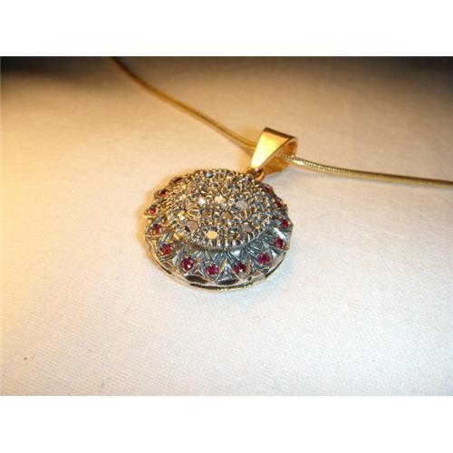 You are looking at an antique 18K rose gold ruby and diamond pendant. This beautiful piece features 16 natural rubies and 19 rose cut diamonds. It measures 7/8 of an inch in diameter. It weighs 6.8 grams. It is in mint condition.