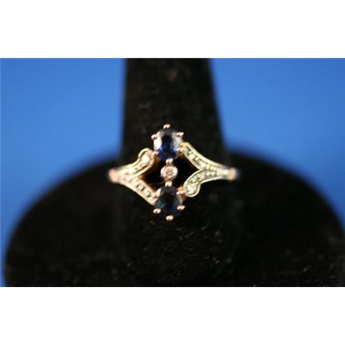 This is a lovely Edwardian ring from c1910. It features 2 blue sapphires of about .20 points each and a 2 point diamond flanked by 10 additional 1 point diamonds. This wonderful ring is set in 18K yellow gold. It weighs 2.0 grams and is a size 6.5 (sizable by me or by your jeweler).