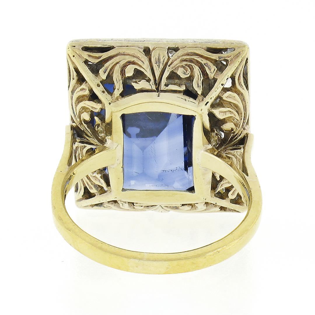 An antique solid 18k yellow and white gold platter ring, with 1 rectangular shape blue stone (13.10x10.60mm ), and 10 old mine cut natural diamonds (G/I - VS2/SI2 ; 1.10ctw). The ring is size 4.0, weighs a total of 7.08 grams, and measures 18.30mm wide.