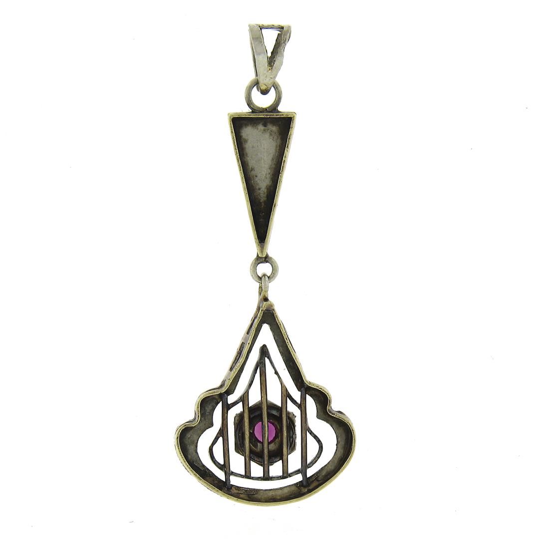 Antique 18K TT Gold Pave Pink Stone Dangle Engraved Open Filigree Work Pendant
