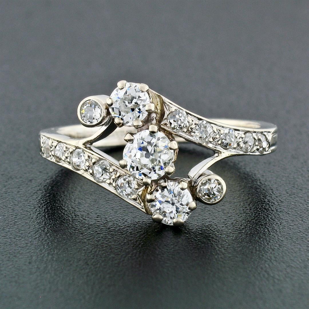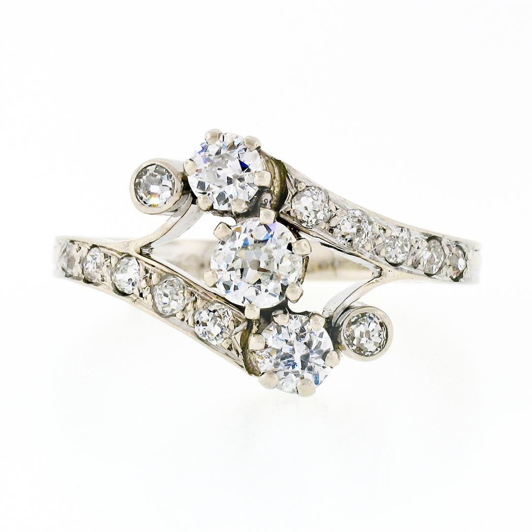 An antique solid 18k white gold bypass ring, with 3 old european cut natural diamonds (G/H - VS2-SI2 ; 0.75ctw), and 12 old european and mine cut natural diamonds (G-I - VS1-SI1; 0.36ctw ). The ring is size 8, weighs a total of 3.80 grams, and measures 12.25mm wide.
