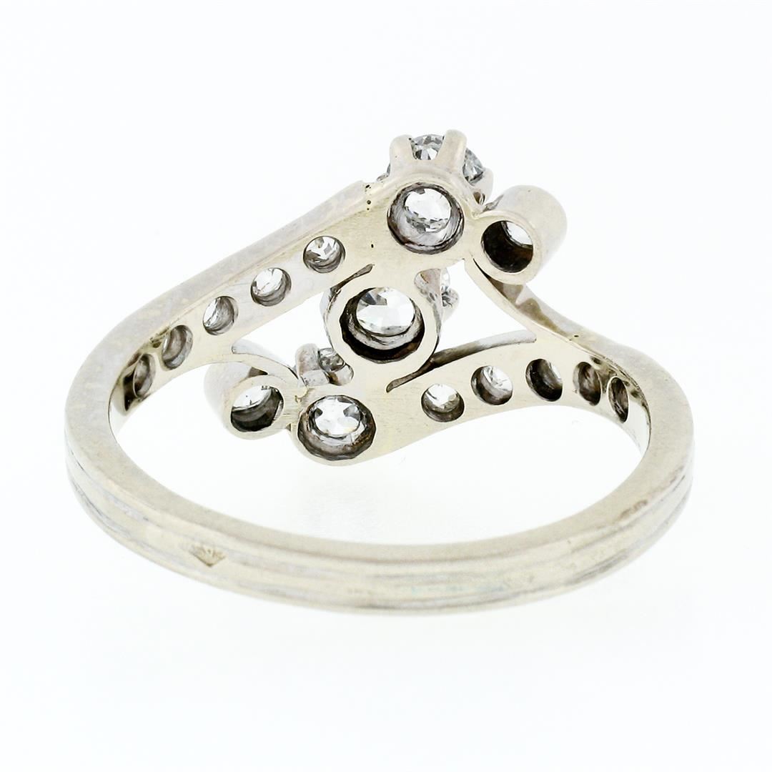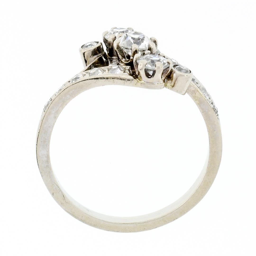 An antique solid 18k white gold bypass ring, with 3 old european cut natural diamonds (G/H - VS2-SI2 ; 0.75ctw), and 12 old european and mine cut natural diamonds (G-I - VS1-SI1; 0.36ctw ). The ring is size 8, weighs a total of 3.80 grams, and measures 12.25mm wide.