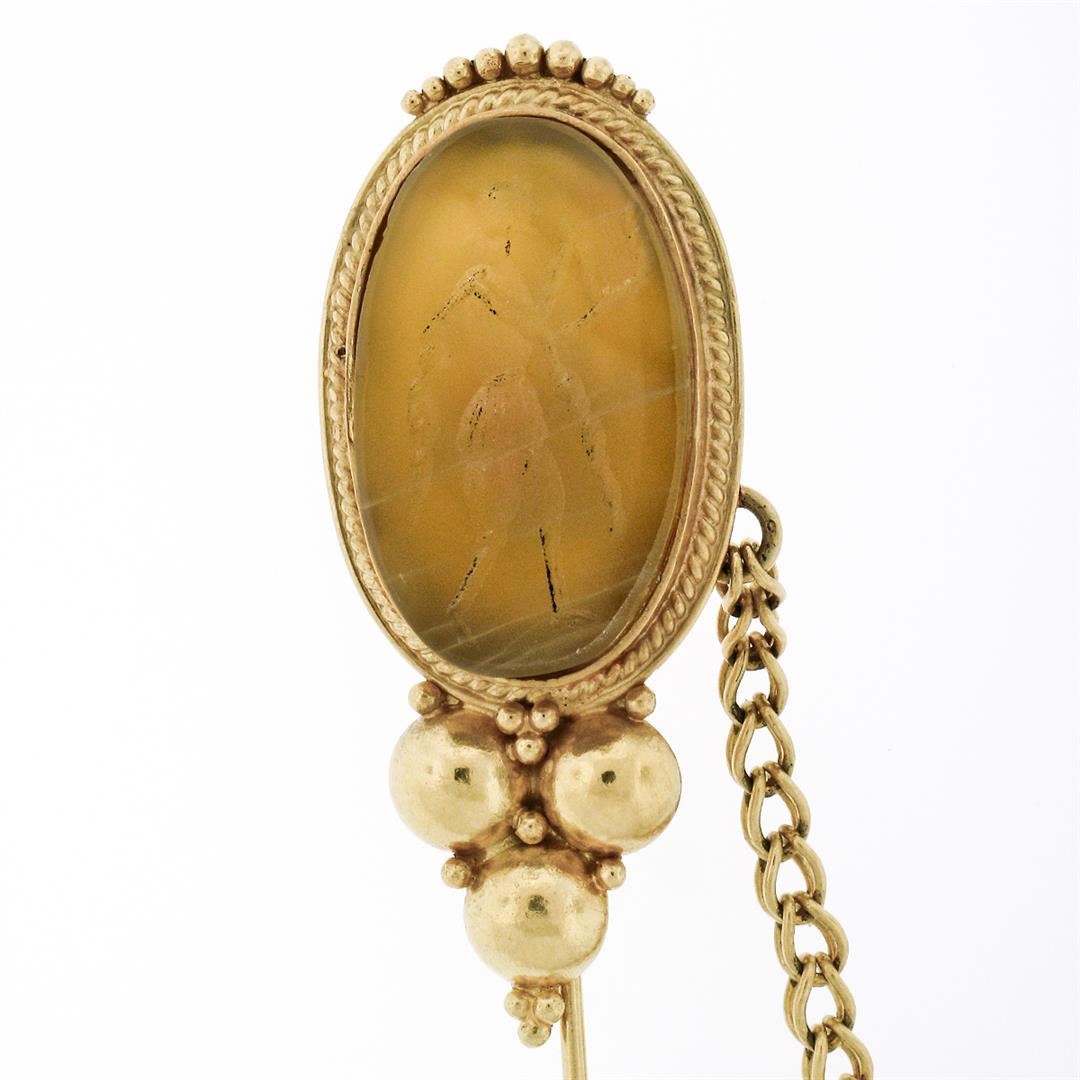 An antique solid 18k yellow gold stick pin with cap and chain, featuring 1 oval shape carved natural agate ( 23.30x14.35mm). Measures 73.40x18.25mm and weighs a total of 11.56 grams.