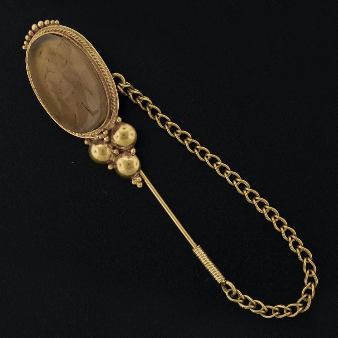 An antique solid 18k yellow gold stick pin with cap and chain, featuring 1 oval shape carved natural agate ( 23.30x14.35mm). Measures 73.40x18.25mm and weighs a total of 11.56 grams.