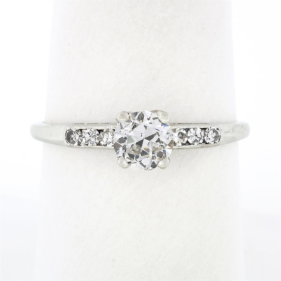 An antique solid 18k white gold engagement ring, with 1 old european cut natural diamond (H - SI1 ; 0.60ct ), and 6 old single cut natural diamonds (G/H - VS1/VS2 ; 0.12ctw ). The ring is size 9.0, weighs a total of 2.38 grams, and measures 5.4mm wide.