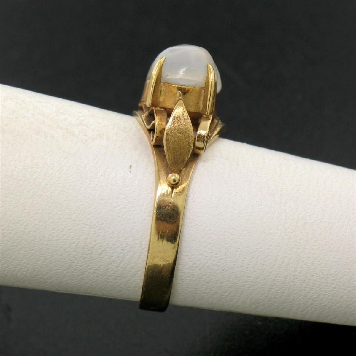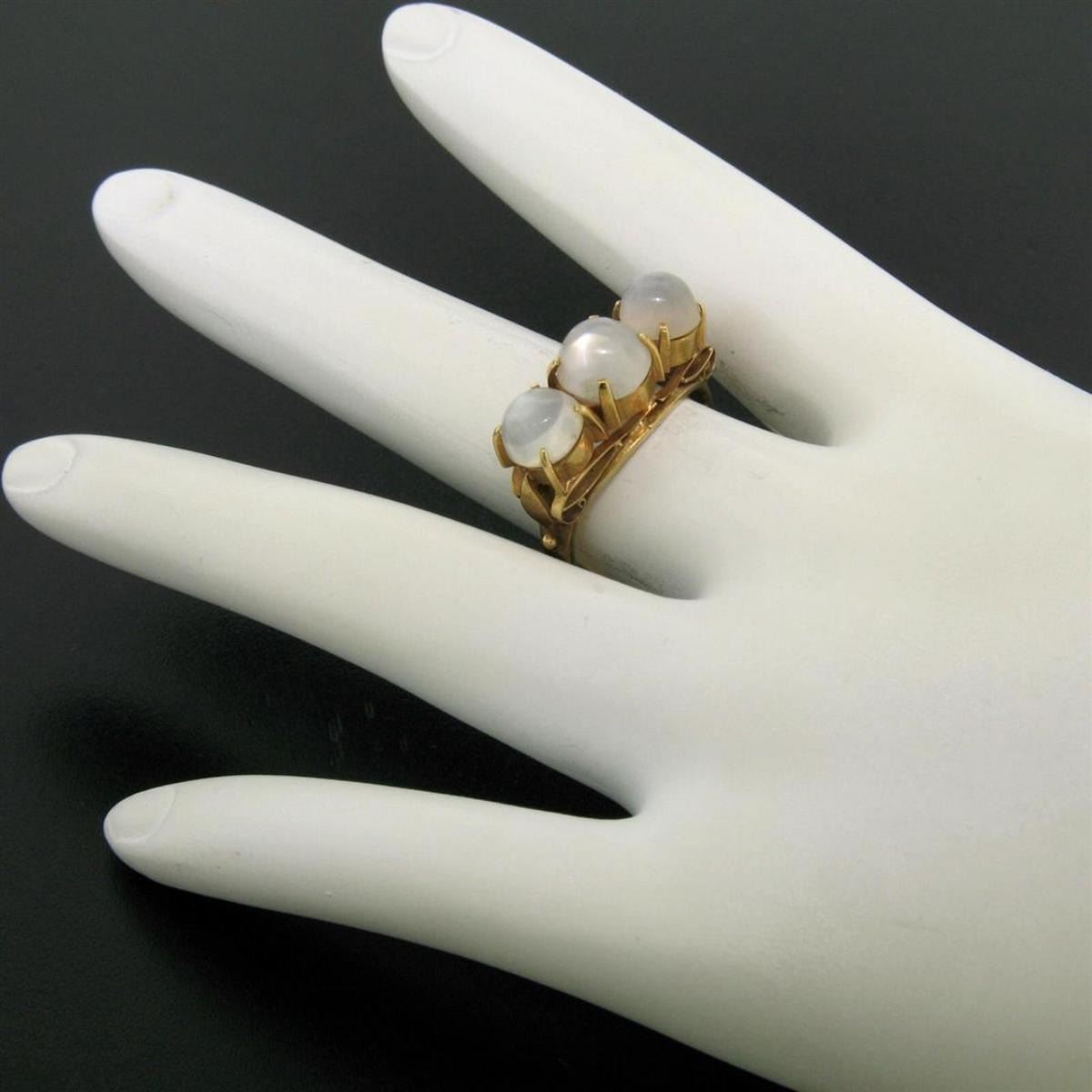 One Antique 18k Rose Gold 4.50ctw Three Stone Cabochon Moonstone Open Work Band Ring. Item Details: Material: 18k Solid Rose Gold, Weight: 4.5 Grams, Stone(s): (3) Natural Genuine Moonstone - Round Cabochon Cut - Prong Set - Grayish Blue Color, Total Carat Weight: 4.50 (approx.), Ring Size: 6.0 , Ring Width: 9.0mm, Ring Height: 7.9mm rise off the finger, Condition: Antique, original stones and patina. Excellent condition!