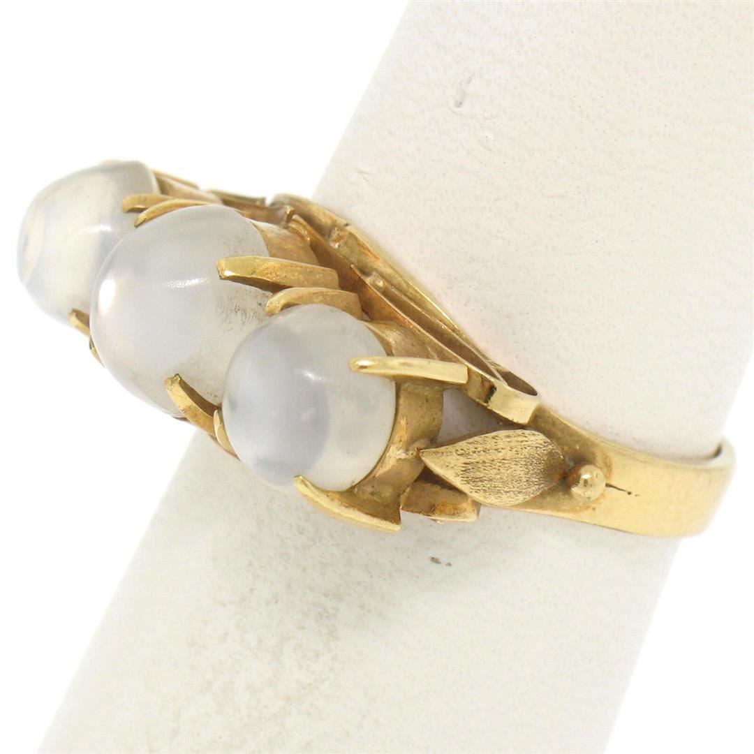 One Antique 18k Rose Gold 4.50ctw Three Stone Cabochon Moonstone Open Work Band Ring. Item Details: Material: 18k Solid Rose Gold, Weight: 4.5 Grams, Stone(s): (3) Natural Genuine Moonstone - Round Cabochon Cut - Prong Set - Grayish Blue Color, Total Carat Weight: 4.50 (approx.), Ring Size: 6.0 , Ring Width: 9.0mm, Ring Height: 7.9mm rise off the finger, Condition: Antique, original stones and patina. Excellent condition!
